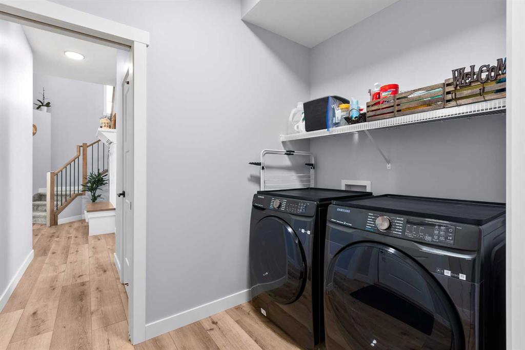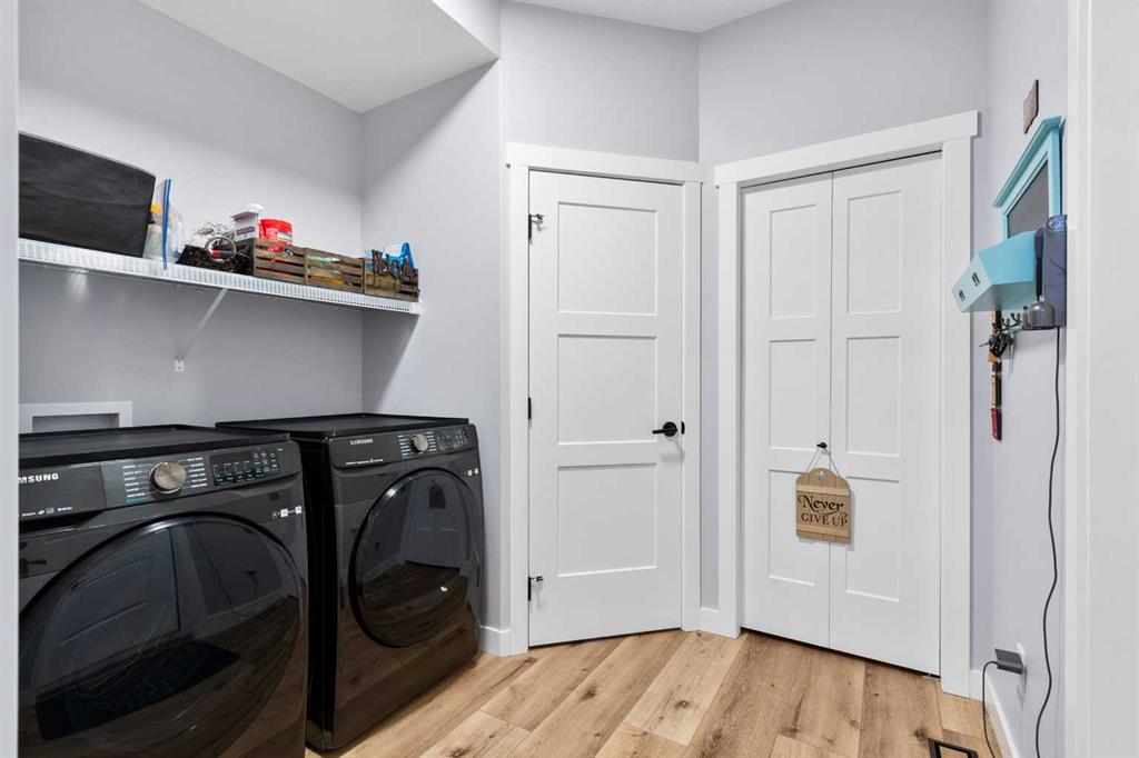 This spotless home was built by a local reputable builder (Anchored Custom Homes) and it backs the Nature Space in Carstairs. It has many added features such as extra windows, special trim, oversized island, wood shelves and much more that is evident when you walk through. The front entry is spacious with its full height ceiling. Go next Into the great room which has vaulted ceilings and vinyl plank flooring. The generous sized living room has a gas fireplace with windows on each side and a brick feature wall. The bright white kitchen has a large island with quartz counters and lots of counter space and cabinets. The microwave is tucked under the counter and the pantry is a walk thru one with wood shelves. The dining room is large enough for a big table and has a big window which faces the back yard and the view of the park/nature space WITHOUT ANY NEIGHBORS BEHIND. The door from the dining area leads to the covered back deck and the partially fenced yard. There is an area with gravel that is ready for a patio level. Back inside on the main floor is the powder room with quartz counter, a laundry room and the entry to the garage. The 23x24 ft garage is insulated, drywalled and painted and has an infrared heater. It easily fits 2 vehicles. Upstairs you will find a large primary bedroom with ensuite which has double vanities and a separate shower as well as soaker tub. The walk in closet is large. There are 2 more bedrooms on this level with nice windows and great closets. The main bathroom is large. The basement is ready for your development ideas with large windows and 9 ft ceilings. There is an alley on the west side of the house which makes RV parking easy. Make an appointment today to see this special home. You will not be disappointed.