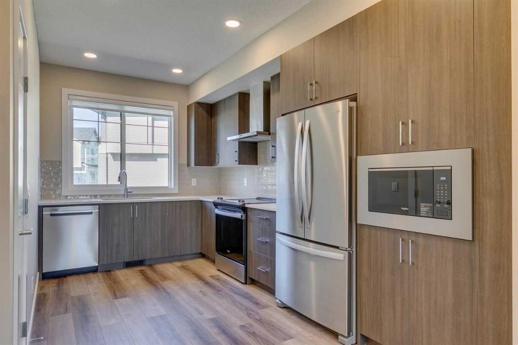 Welcome to Chelsea Court and the impressive \"Regent\" townhome by Trico Homes, one of Calgary’s premier local builders. This thoughtfully designed residence features 2 bedrooms, 2.5 bathrooms, and over 1,301 square feet of well-planned living space. On the entry level, you\'ll find a versatile closed flex room with a closet and an oversized one-car attached garage. The main floor offers a private front deck with a gas line, perfect for enjoying views of the green spaces and walkways. Inside, the open-concept layout is highlighted by 9-foot ceilings, four flush-mounted LED lights in the great room, and a modern kitchen equipped with quartz countertops and semi-built-in stainless-steel appliances. Additional features include a rough-in for air conditioning and zebra blinds on all windows to ensure comfort throughout the year. Upstairs, the owner’s bedroom includes a spacious walk-in closet and a private 4-piece ensuite. Photos are representative
