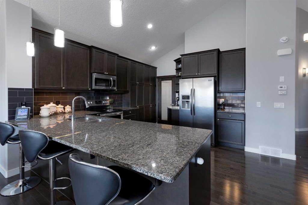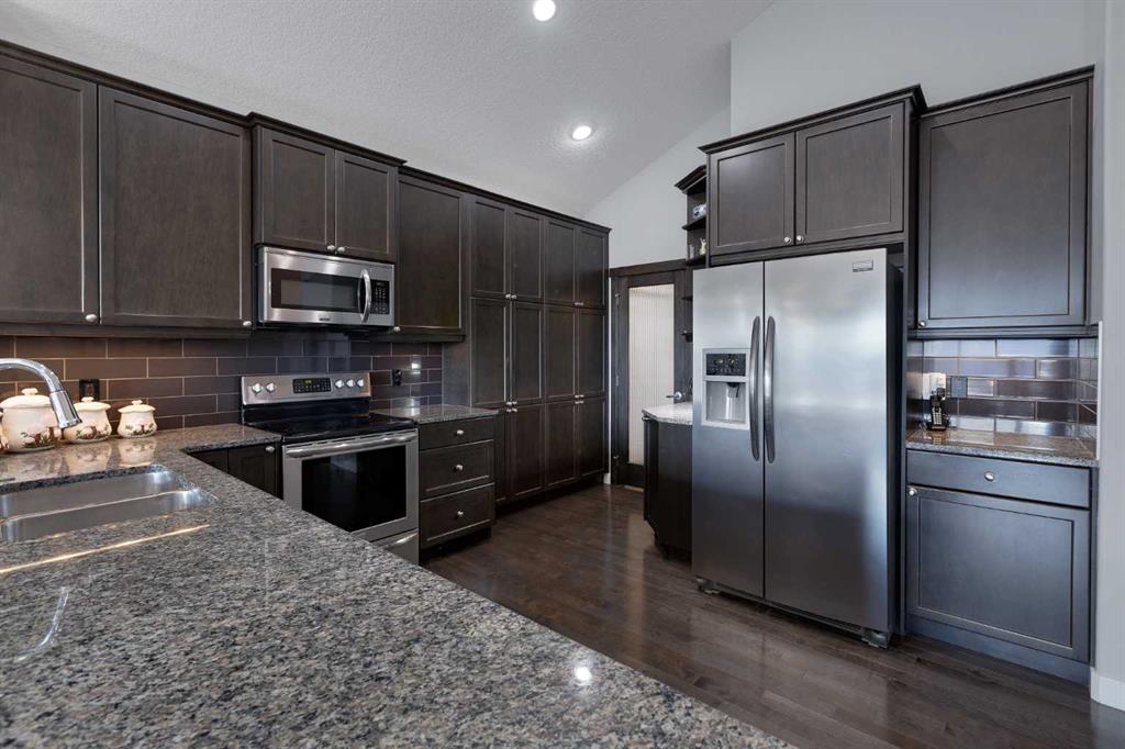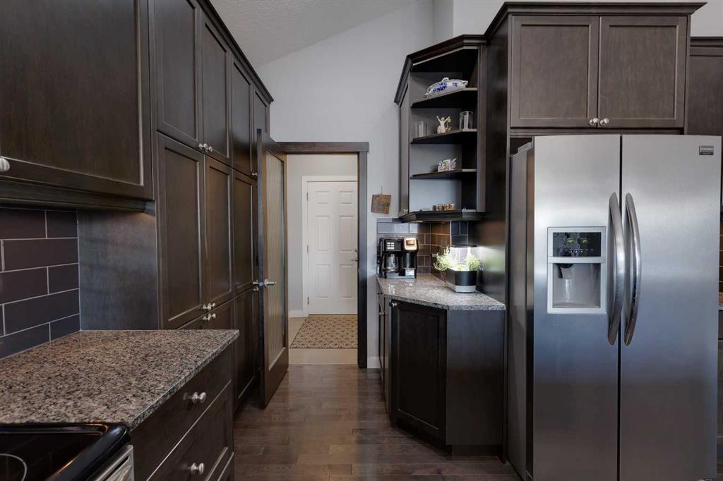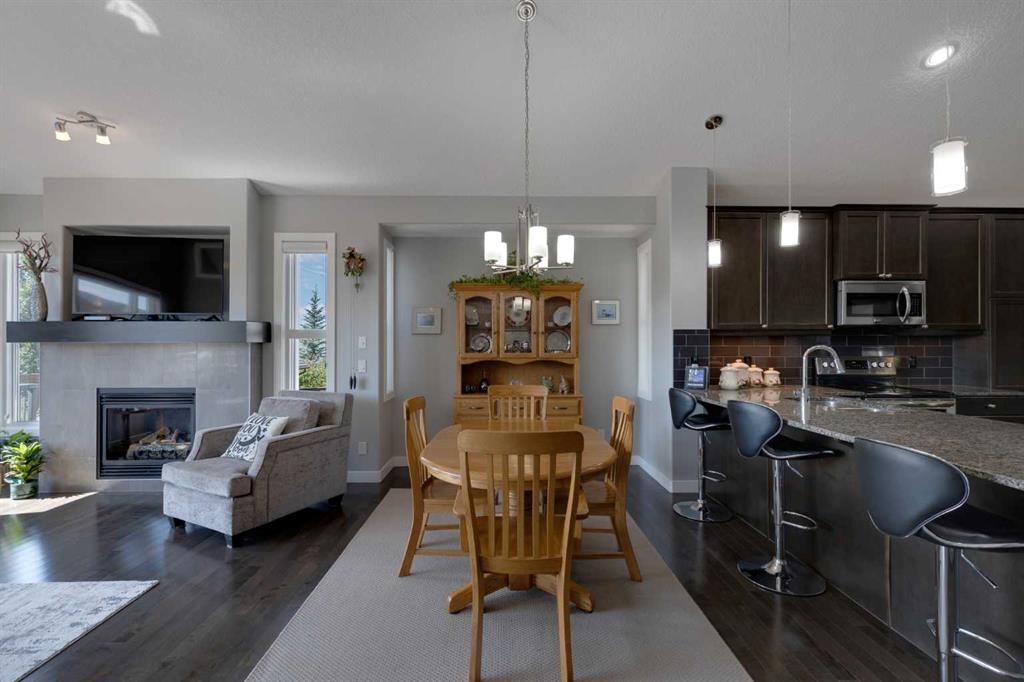 Main floor highlights include bright, open-concept layout with hardwood, tile, and carpet flooring. A huge kitchen features stainless steel appliances, ample cabinetry, under-cabinet lighting, and generous storage space. The living room with gas fireplace and large windows (upgraded number of windows) provides a welcoming atmosphere. Convenient main floor laundry. Primary suite has heated floor ensuite, soaker tub, walk-in closet, and beautiful finishes like vaulted ceiling and windows. Two additional decks (one front and two in back) for morning coffee or evening conversations with friendly neighbours. Basement features include 9\' ceilings creating a spacious feel throughout, large bonus/family room, two well-sized bedrooms with oversized windows for natural light. There is a full bathroom and even a wine/beer making room with sink, cold storage room, and additional storage areas. Additional features to the home include: radon mitigation system, Hunter Douglas blinds throughout main floor, central vacuum system included, security system (assumable for $40/month). RV parking area can be restored to grass if owner chooses and this corner lot has great curb appeal. Beautifully landscaped yard with underground irrigation, garden plots, and the three decks for entertaining or relaxing. Low maintenance space between this home and next door, as well. This thoughtfully designed bungalow offers the perfect mix of indoor comfort and outdoor enjoyment. Located close to walking paths, parks, and all the amenities Cochrane has to offer, it’s ideal for families, downsizers, or anyone seeking single-level living with space to grow. Highway 1A allows quick access to Ghost Lake and Canmore/Banff or east to Calgary.