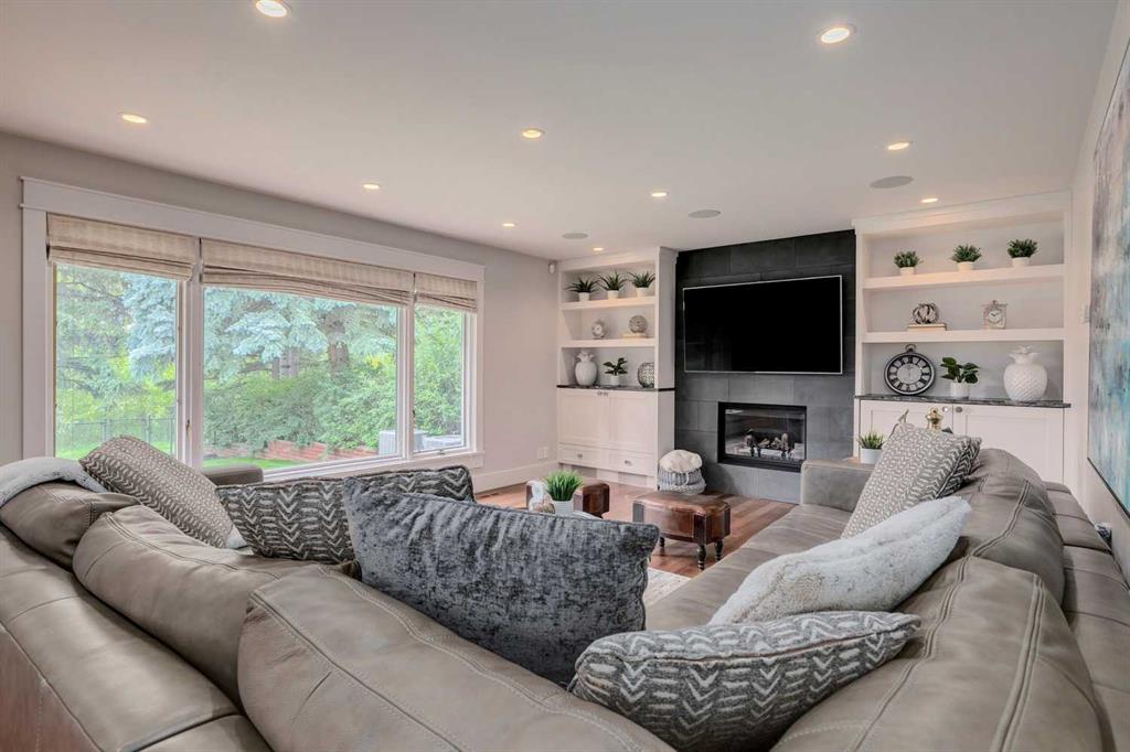The living and dining areas are warm and welcoming, each anchored by a marble-surround fireplace and framed by expansive windows that flood the space with natural light. Upstairs, four spacious bedrooms provide comfort and privacy, including a luxurious primary retreat with serene views over South Glenmore Park. The spa-inspired ensuite features heated marble floors, a Neptune jetted tub, a Grohe rain shower with multiple heads, and double sinks, while the grand, showroom-style walk-in closet offers a central make-up station and separate, thoughtfully designed spaces for him and her. Two additional generously sized bedrooms each include walk-in closets—one with its own three-piece ensuite—while the fourth bedroom is currently styled as a home office. A well-appointed five-piece bathroom and a convenient hallway double linen closet complete this exceptional upper level.