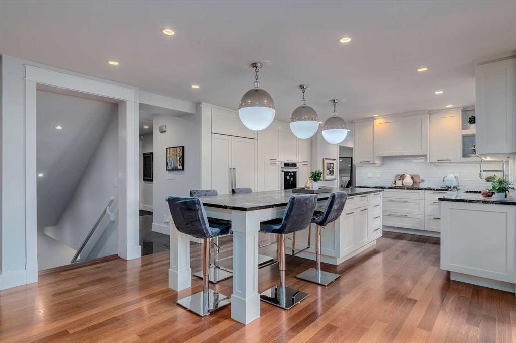 Inside, rich Merbau site-finished hardwood floors lead you through a thoughtfully designed layout. The gourmet kitchen is a chef’s dream, featuring a panelled Sub-Zero refrigerator, Thermador induction cooktop and double ovens, Bosch dishwasher, and a built-in slide-door microwave. Custom maple cabinetry pairs beautifully with titanium granite countertops, a striking glass tile backsplash, and elegant Hicks pendant lighting.