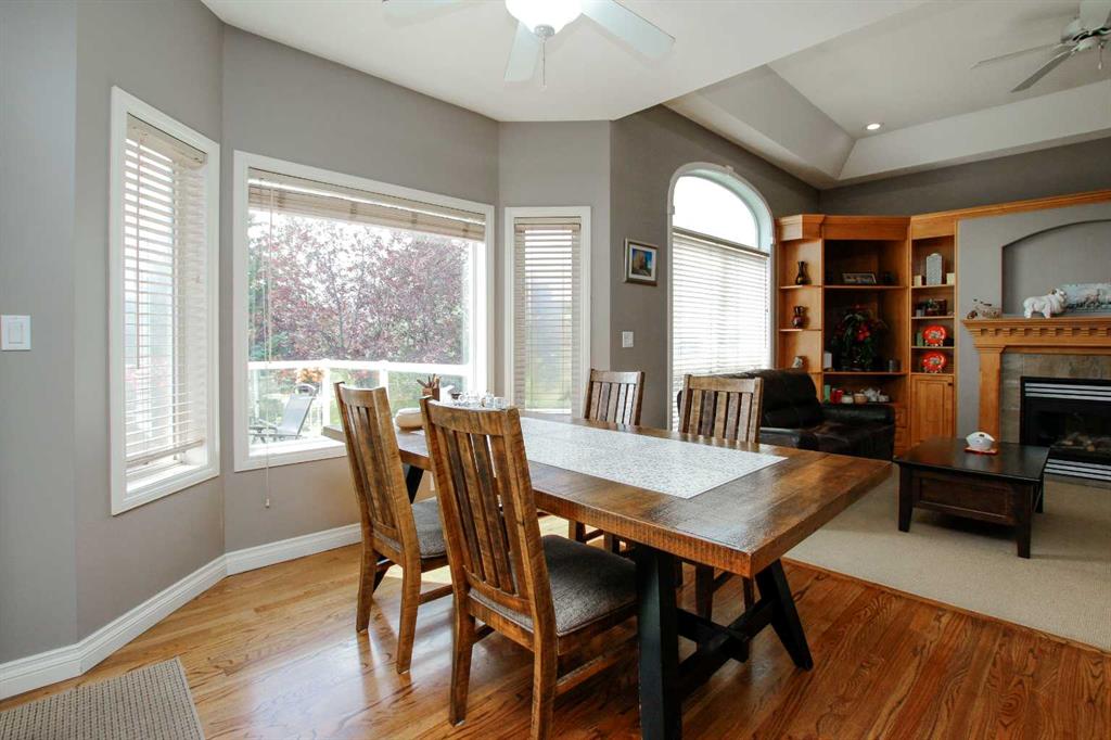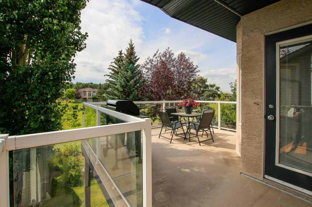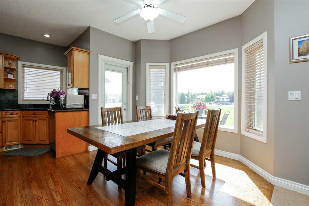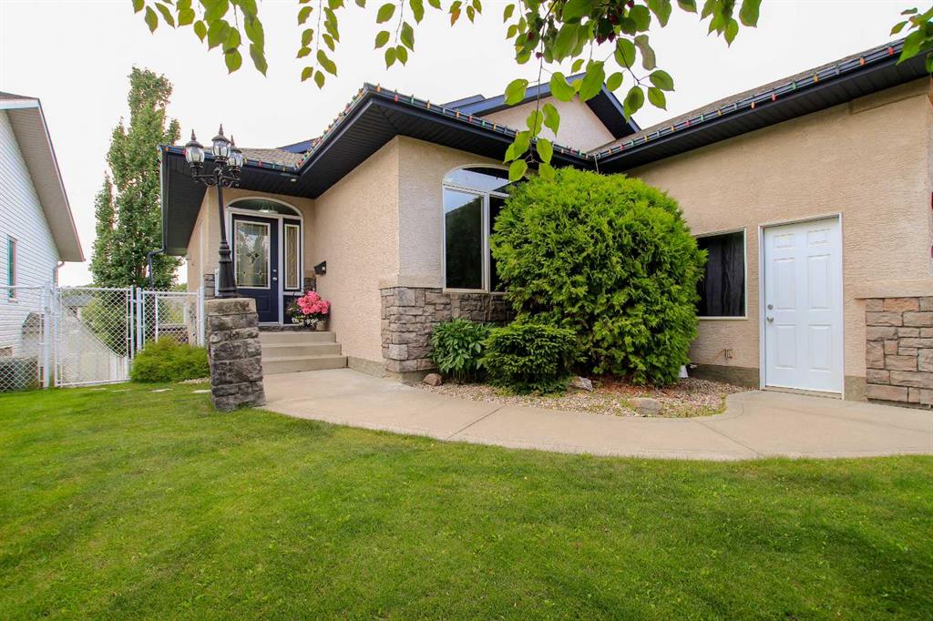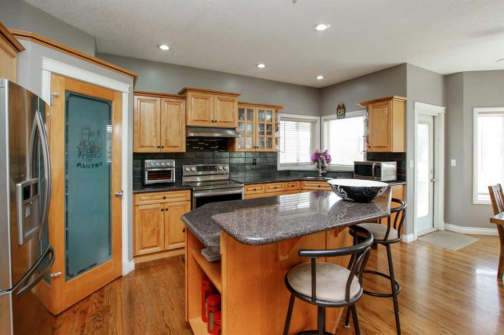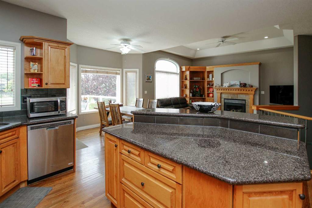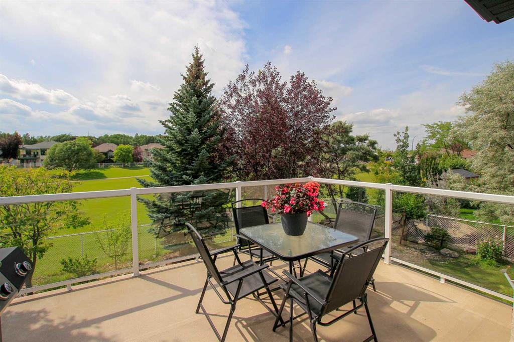 IMMEDIATE POSSESSION AVAILABLE ~ FULLY DEVELOPED WALKOUT BUNGALOW ~ BACKING ONTO A TREED PARK & WALKING TRAIL ~ 24\' X 24\' HEATED GARAGE ~ CENTRAL AIR CONDITIONING ~ Mature landscaping in the front yard is complemented by a stucco and stone exterior, offering eye catching curb appeal ~ A spacious foyer with tile flooring, a coat closet with mirrored doors and a lighted niche welcome you ~ Open concept main floor layout is complemented by high ceilings and hardwood flooring ~ The kitchen offers a functional layout with plenty of light stained cabinets with crown moulding and extra large storage drawers, endless granite countertops including an island with a raised eating bar, full tile backsplash, undermount sink with a window above, stainless steel appliances and a walk in corner pantry ~ The dining space is surrounded by large windows and can accommodate large gatherings with ease ~ Garden door access off the dining room leads to the sunny west facing deck with glass and aluminum railings for unobstructed park views, Duradek finish, BBQ gas line, and stairs to the yard ~ The living room has more large windows offering natural light, tray ceilings, built in shelving and a cozy gas fireplace ~ The primary bedroom can easily accommodate a king size bed plus multiple pieces of furniture, has a huge walk in closet with built in shelving and a spa like ensuite featuring a jetted tub, separate shower, and oversized vanity ~ Second main floor bedroom is also a generous size with vaulted ceilings, large windows, ample closet space and would make a great home office or guest room ~ Conveniently located main floor laundry ~ 2 piece main floor bathroom ~ The fully finished walkout basement has large above grade windows, high ceilings, and roughed in underfloor heating ~ Massive L-shaped family room offers tons of space for a games table and sitting area and features a cozy gas fireplace with a tile surround, a wet bar, and garden door access to the lower covered deck and backyard ~ Three basement bedrooms offer plenty of space and ample closet space, including one bedroom with a huge walk in closet ~ Well appointed 4 piece bathroom featuring an oversized vanity ~ Heated 24\' x 24\' double attached garage is insulated and finished with drywall ~ The beautiful backyard is landscaped with well established trees, shrubs and perennials, has an irrigation system with a timer, calming pond with a waterfall, a garden shed for storage, and is fully fenced with direct access to the treed park and green space ~ Excellent location in a quiet cul-de-sac, walking distance to schools (all grades and divisions), excellent shopping plazas with all amenities, Collicut Rec Centre, plus numerous walking trails, parks and playgrounds all close by ~ Immediate possession and move in ready!