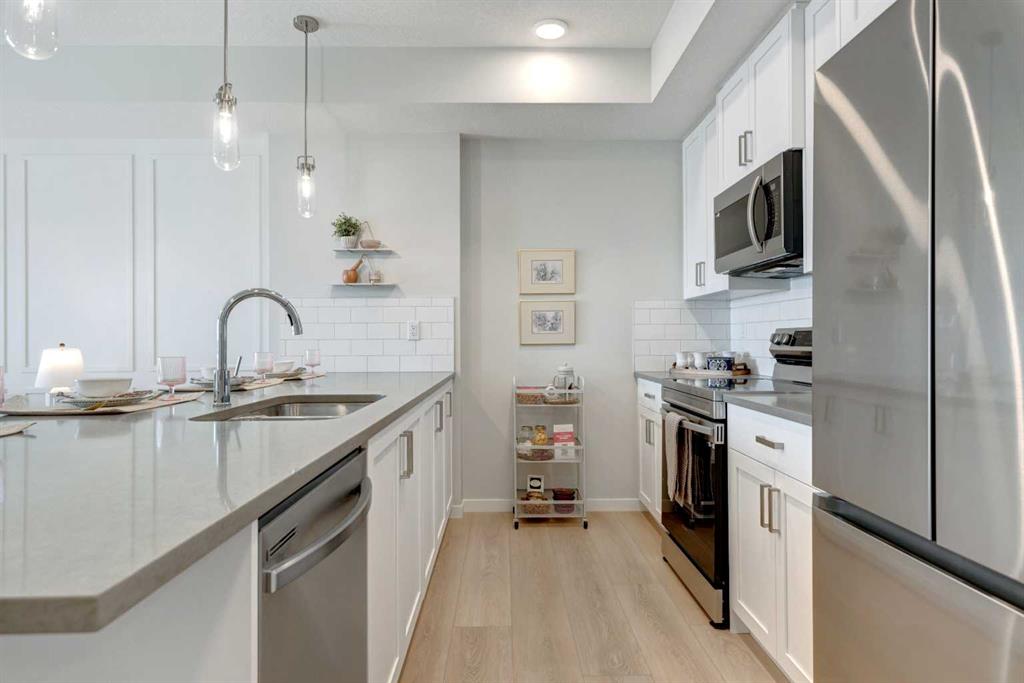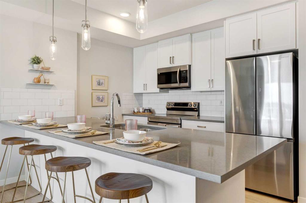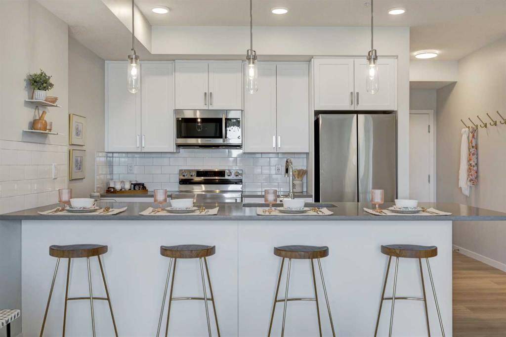 INTRODUCING ALPINE PARK PLACE, IN BEAUTIFUL SOUTHWEST CALGARY. BUILT BY CEDARGLEN LIVING, WINNER OF THE CustomerInsight BUILDER OF CHOICE AWARD, 5 YEARS RUNNING! BRAND NEW \"A\" unit with high-spec features. You will feel right at home in this well thought-out, 514. RMS sq.ft. (565 sq.ft. builder size). 1 bed, 1 bath home with open plan, 9\' ceilings, LVP flooring throughout common areas, carpets in the bedrooms and closets, Low E triple glazed windows, BBQ gas line on the patio, Fresh Air System (ERV), and so much more. The kitchen is spectacular with full height cabinets, quartz counters, undermount sink, rough-in water line to the fridge and S/S appliances. The island is extensive with built in flush breakfast bar, which transitions into the spacious living area, perfect for entertaining. The spacious bedroom has a large bright window (triple pane windows) and sizeable closet. Right beside your bedroom is a 4pc bath with quartz counters, and undermount sink. Nearby is the spacious laundry/storage room, this is a must see (washer & dryer included). Highlights include: Hardie board siding, designer lighting package, sound reducing membrane to reduce sound transmission between floors, clear glass railing to balconies and 1 titled surface parking stall included (storage lockers available for purchase). A once in a lifetime community in Southwest Calgary. PET FRIENDLY COMPLEX, PRE-CONSTRUCTION OPPORTUNITY, PURCHASER CAN STILL MAKE SELECTIONS, and PHOTOS ARE OF A DIFFERENT SHOW SUITE FOR REFERENCE ONLY, FINISHING\'S/PLAN WILL DIFFER. ESTIMATED COMPLETION RANGE IS JUNE 2026-JUNE 2027. VISIT THE SHOW SUITE TODAY FOR MORE INFO & FALL PROMOTION!