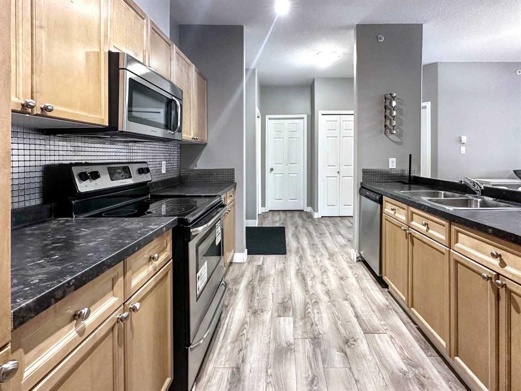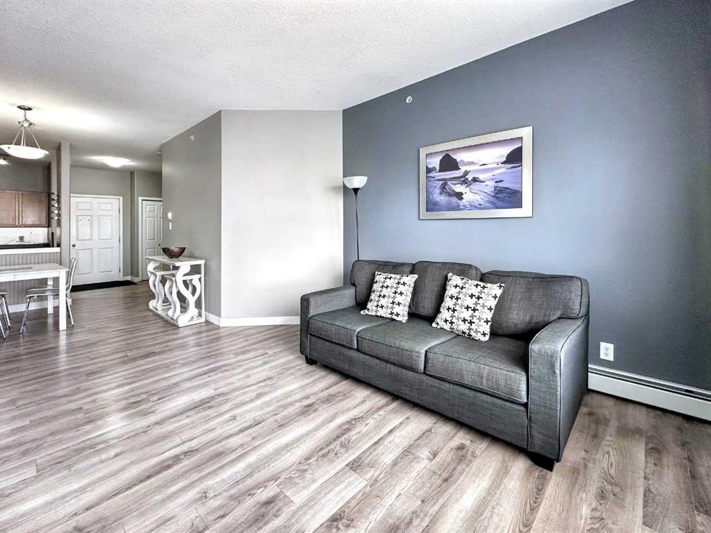 This quiet 2 bedroom, 2 bathroom condo with vinyl plank flooring, generous balcony is bright, stylish and family friendly! Step into this beautifully finished top floor condo, with upgraded floors, and an open spacious floor plan. The kitchen is well appointed with lots of cabinets and counter space, as well as stainless appliances. The in unit laundry area has tons of storage and the washer and dryer is less than a year old. The primary bedroom has a full 4pc ensuite and w/i closet, and leads to a private balcony. The second bedroom is large and comes with a double closet with closet organizers. Another 4pc bathroom and two storage closets complete the unit. There is an underground titled parking stall, and the building is equipped with an elevator and ground level guest parking. Located in a quiet neighbourhood close to schools, parks, walking trails, shopping and all bus routs! There is doctors office, restaurants, wellness spas and pharmacy within walking distance! This unit comes furnished and is move in ready, so call to view today!