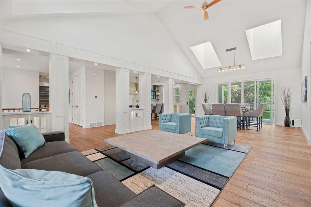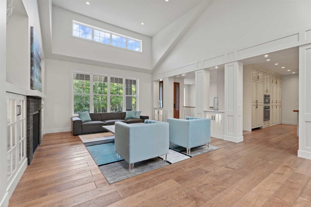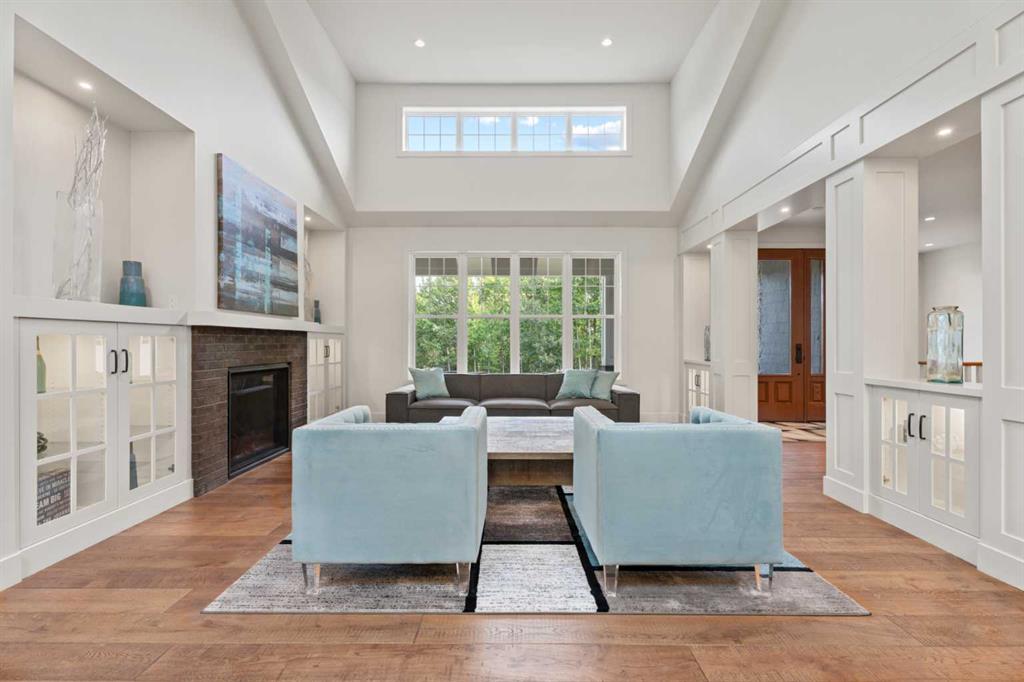 Car enthusiasts!! Set on 5.14 acres of stunning treed and open landscape, just minutes from Calgary and Okotoks, this exceptional custom-built modern farmhouse offers a rare balance of architectural refinement, privacy, and natural beauty. Designed for those who appreciate craftsmanship and quiet luxury, the home presents as a private estate—serene, elegant, and timeless. A paved, curved driveway leads to a gated entrance, introducing a picturesque setting of green space and mature trees. Inside, 17-foot vaulted ceilings and expansive windows fill the main living spaces with natural light, creating an immediate sense of openness and calm. The living room is anchored by a refined gas fireplace and custom built-ins, offering a warm and inviting atmosphere for both everyday living and intimate gatherings.