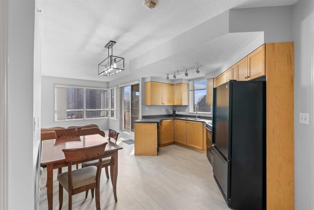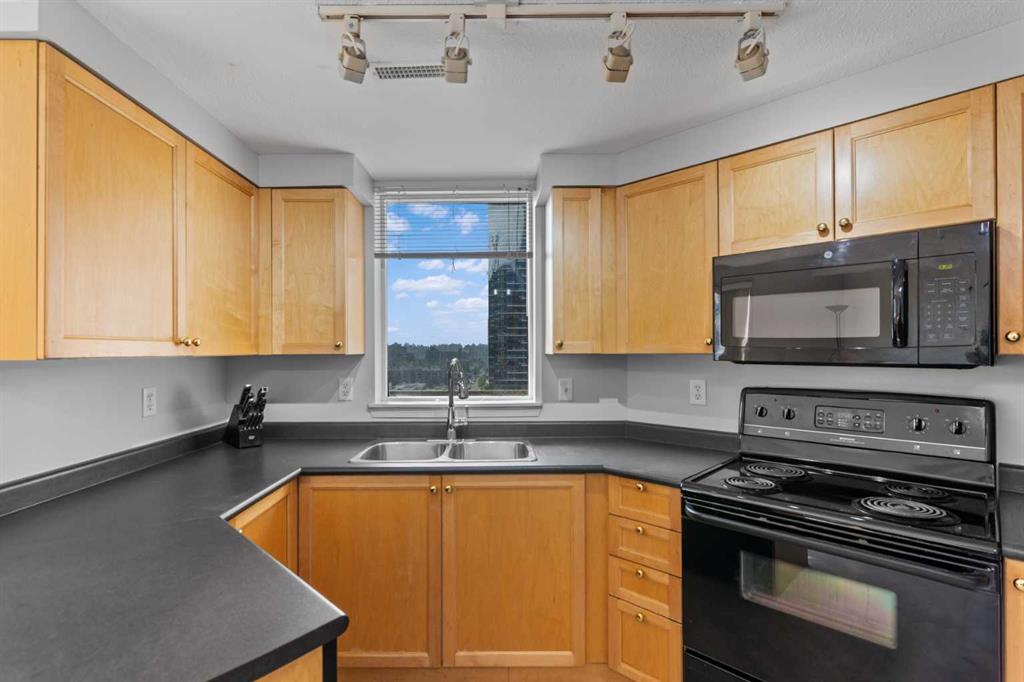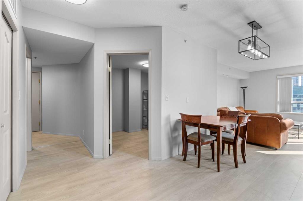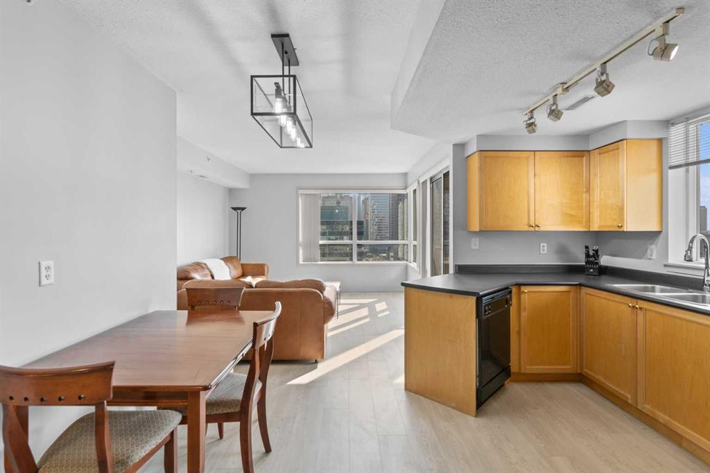 This move-in ready CORNER UNIT in the amenity-rich Vista West building combines city views with a maintenance-free lifestyle in a quiet concrete building. The open floor plan is bathed in natural light through corner windows, creating a bright and welcoming atmosphere. Updated wide plank flooring adds modern style while central air conditioning ensures year-round comfort. A well-designed kitchen offers abundant cabinet and counter space, an extra window above the sink for added natural light and flows easily into the dining area enhanced by updated designer lighting. The living room is framed by corner windows showcasing captivating downtown views. Patio sliders lead to a large curved balcony with gas line and glass railings that preserve the phenomenal cityscape, setting the stage for casual barbeques or quiet evenings outdoors. A spacious bedroom also captures the views, while a large den provides the flexibility for a home office or hobby room. The 4 pc bathroom is well appointed and in-suite laundry adds everyday convenience. This unit includes its own furnace and A/C so you can control your comfort with ease. Building amenities extend the lifestyle with underground parking, a well-equipped fitness room and a recreational lounge with games, books and gathering areas for connecting with neighbours. The secure building features a beautiful lobby to welcome guests and 24-hour security for peace of mind, including safe package delivery. Location is unbeatable with the Kirby LRT Station and free-ride zone right outside the entrance, making commuting effortless. River pathways, restaurants, coffee shops and daily services are all within walking distance, along with convenient street-level shops right in the building. Cowboys Park (formerly Shaw Millennium Park), a variety of entertainment venues and downtown’s extensive amenities are also just steps away. This is an ideal home base for enjoying downtown living while having every comfort and convenience close at hand!