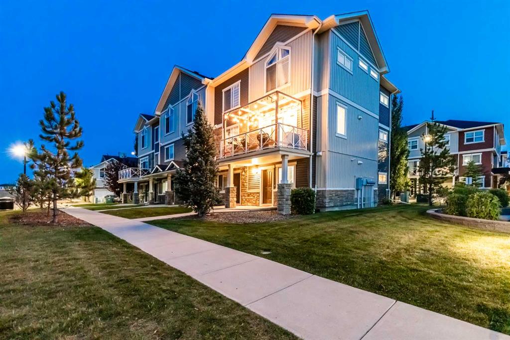 ***MODERN AIR-CONDITIONED CORNER UNIT!*** Step into this bright and open concept, former show home with 2 primary bedrooms, PLUS Office/Den/Guest bedroom on the main floor, 2.5 bathrooms. The living room has a full feature REAL stone wall with a built-in custom cabinet and shelving unit. An elegant electric fireplace.  The Kitchen has silver pearl granite countertops, a large island with an eating bar, a formal dining room. Perfect for relaxing and entertaining is the patio door off the dining room that leads onto a balcony, which is fitted with a custom-built removable pergola,  string lights and a natural gas line, makes it the perfect outdoor space for BBQ, you’ll never have to run out for propane in the middle of cooking dinner ever again! The spacious upper level comes with a vaulted ceiling throughout the whole upper floor, it offers a generous bedroom, 4pc bathroom, a large primary bedroom with room for a king-size bed, a walk-in closet, and a 3pc ensuite bathroom comes with a heated tile floor to keep your toes warm after your shower, and upgraded vanity with quartz countertop. The laundry/storage room is also conveniently located on this level next to all the bedrooms. The whole house has upgraded décora light switches with added multiple dimmers switches, timers, smart switches and led lighting. The single attached garage has additional custom-built storage shelving units. This CORNER UNIT is perfectly located  next to the street of Skyview Ranch Manor, which offers ample public street parking in addition to visitor parking space just next to the unit. With nearby school and shopping, this home has it all. Don’t wait, make this one yours today!