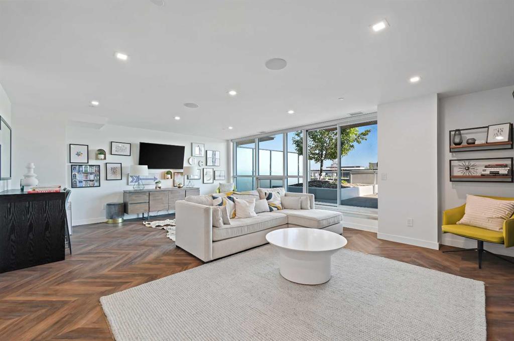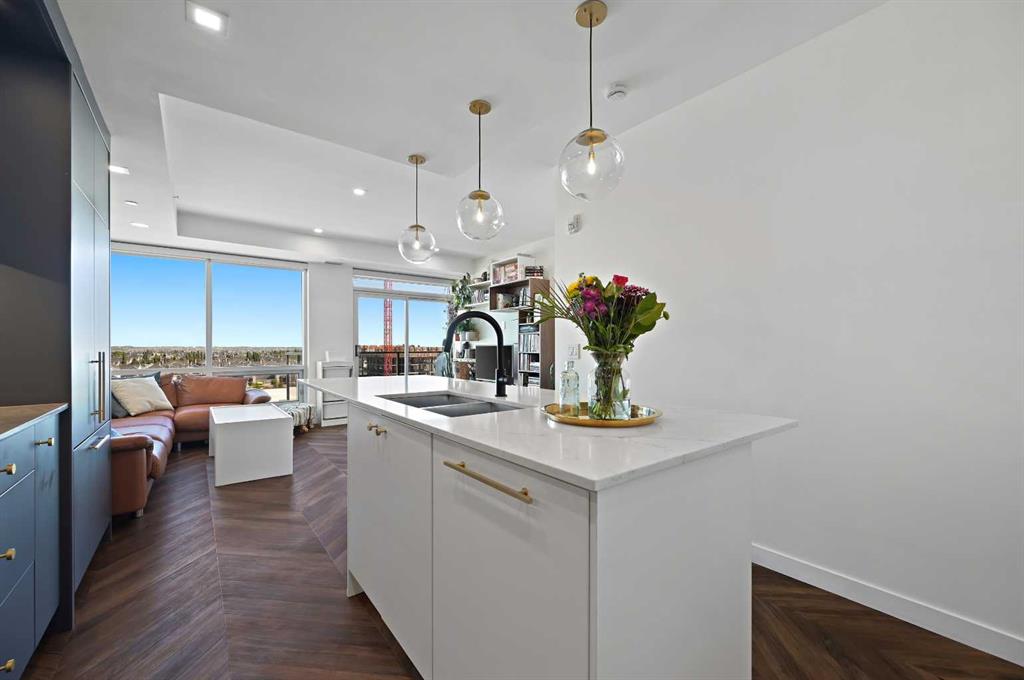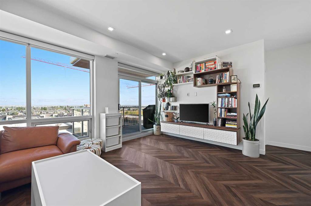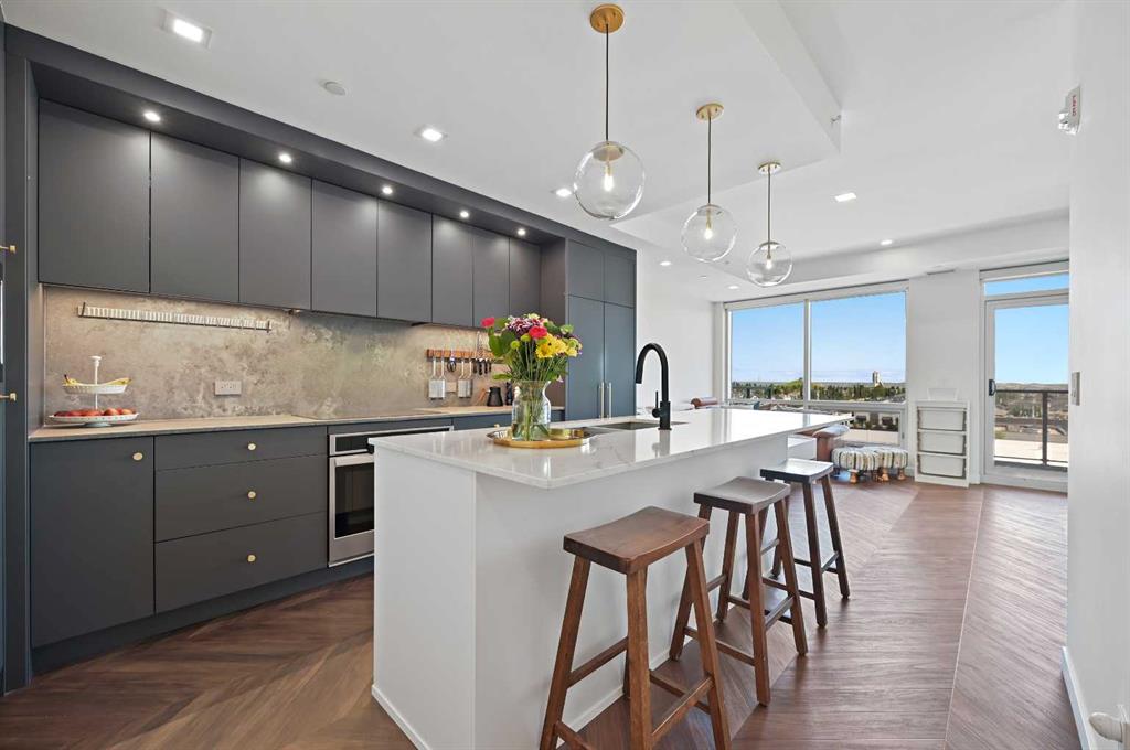 Inside, discover Truman’s sophisticated New York colour palette, wide-plank luxury vinyl flooring, and an open-concept layout filled with natural light. The designer kitchen boasts a premium Thermador induction cooktop, integrated appliances, quartz waterfall island, and full-height cabinetry, while custom California Closets throughout the den, living room, pantry, closets, and bathrooms add storage and style. Floor-to-ceiling north-facing windows open onto a private oversized balcony with breathtaking views stretching from downtown to the Rockies. The serene primary suite features a custom his-and-hers walk-through closet and sleek ensuite, complemented by a second bedroom and full bathroom that provide flexibility for guests, family, or a spacious home office. Additional highlights include central air conditioning, concrete construction for superior sound insulation, a full-size XL washer/dryer, titled underground parking, and a secure private storage locker on an exclusive access-only floor. Step outside to cafés, dining, boutiques, fitness studios, and everyday essentials. Local favourites like UNA Pizza + Wine and Blanco Cantina are in the building, Sobeys is across the street, and Radio Park’s eight acres of green space, playgrounds, and seasonal skating loop are a short stroll away. Top schools are nearby and quick connections to Bow Trail, Stoney Trail, and the future BRT make for an easy commute downtown or a fast escape west to the mountains. With expansive views, luxury finishes, and a vibrant walkable location, Unit 603 at Gateway is West District living at its finest. Book your private showing today.