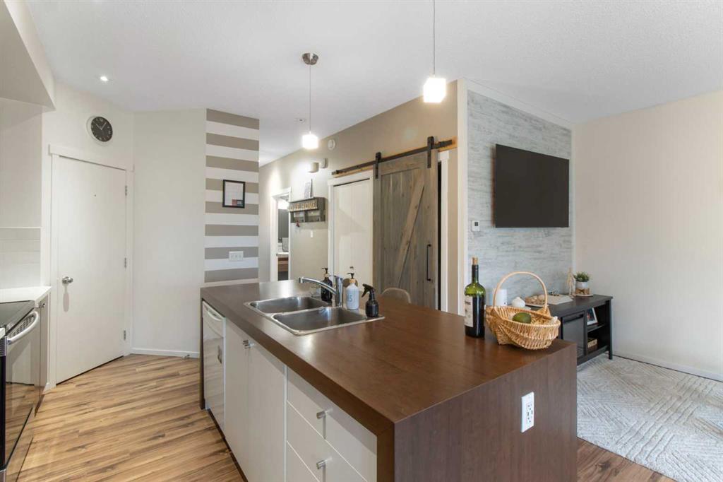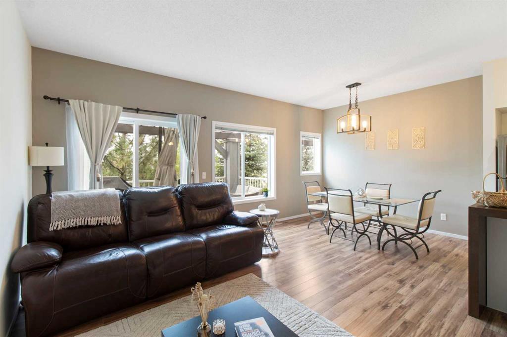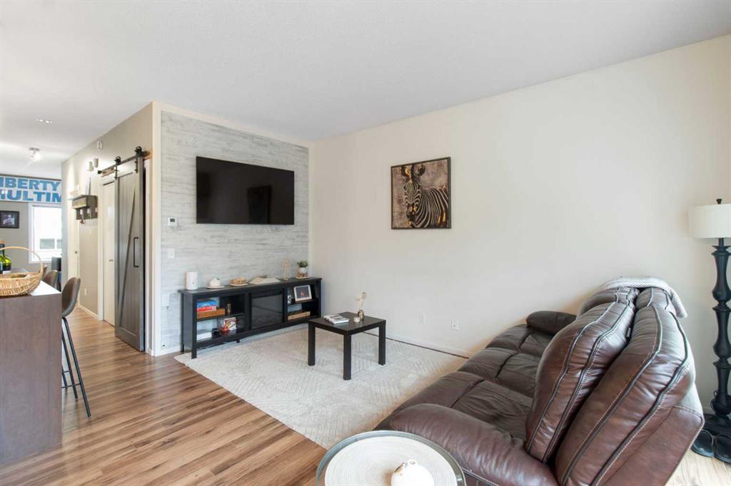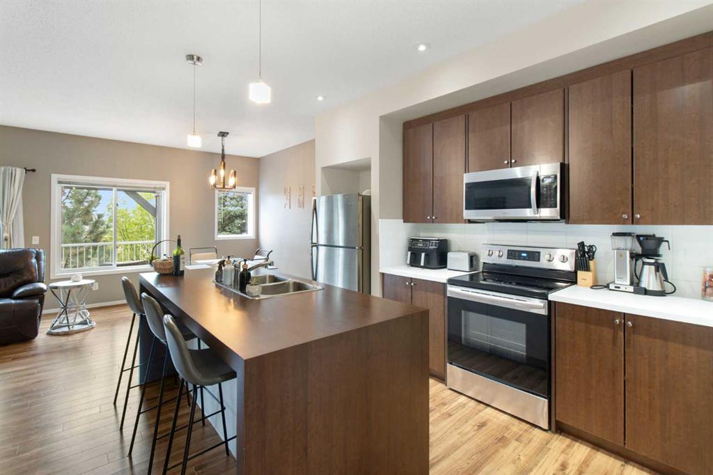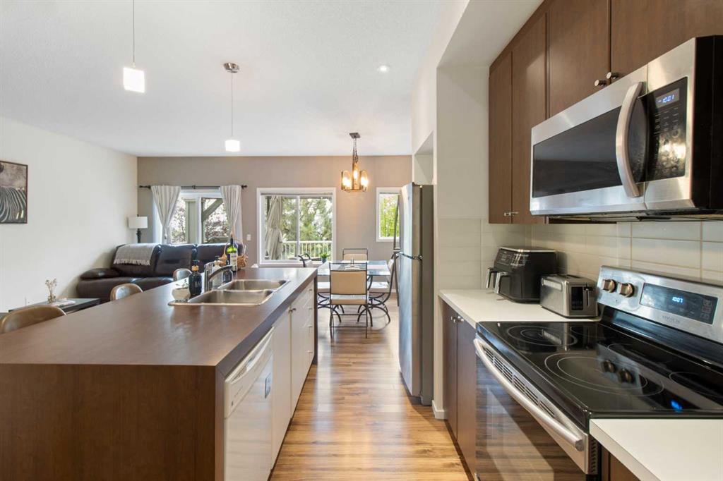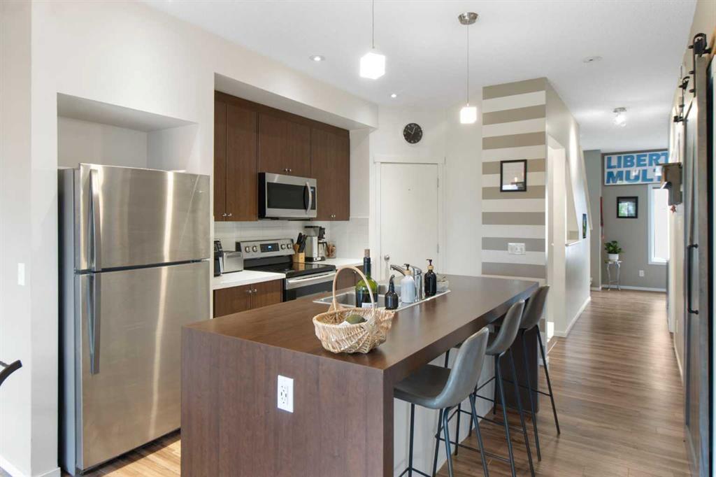 Beautifully styled with modern finishes, this 3 storey townhome offers a bright and functional layout designed for comfort and connection. An insulated and drywalled single attached garage with storage connects to the entry level for everyday convenience. On the main floor, 9’ ceilings set the stage for a bright and open layout. A welcoming living room is styled with a feature wall that adds warmth and character. Patio sliders bring in natural light and open to a south facing balcony with green space views, an ideal backdrop for barbeques or quiet evenings outdoors. The adjacent dining room is anchored by designer lighting and flows easily into the stunning kitchen where 2 toned cabinetry, stainless steel appliances, a pantry and a large island provide both style and utility for casual gatherings or daily routines. A versatile flex space offers endless options for a home office, hobby room, media lounge or gym. Handily a stylish powder room completes this level. Upstairs, a spacious primary retreat includes a walk in closet and a private 4 pc ensuite, while a second large bedroom also enjoys a walk in closet and nearby access to another 4 pc bathroom. Convenient upper level laundry enhances everyday function. Comfort is assured with tankless hot water, in-floor heating and a water softener for efficiency and ease. This quiet complex is surrounded by pathways, parks and green space, with Kenneth D. Taylor School just a short walk away. Nearby Evanston Towne Centre offers shops and restaurants within minutes, while the environmental reserve and winding community pathways encourage a walkable lifestyle in this extremely connected neighbourhood. Offering style, comfort and convenience in equal measure, this home is a perfect fit for today’s modern lifestyle!