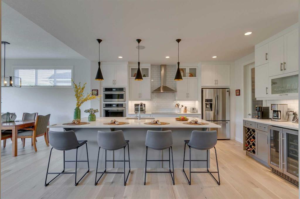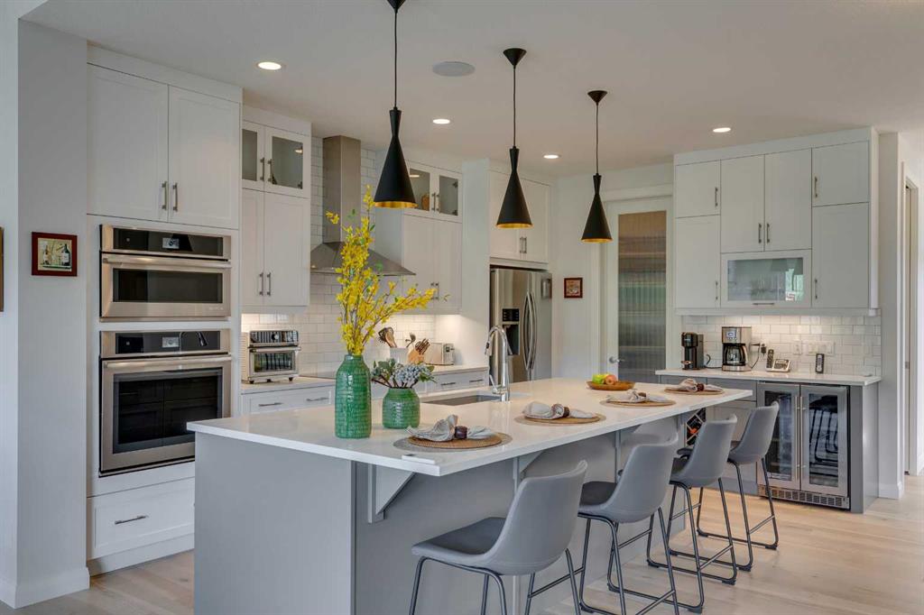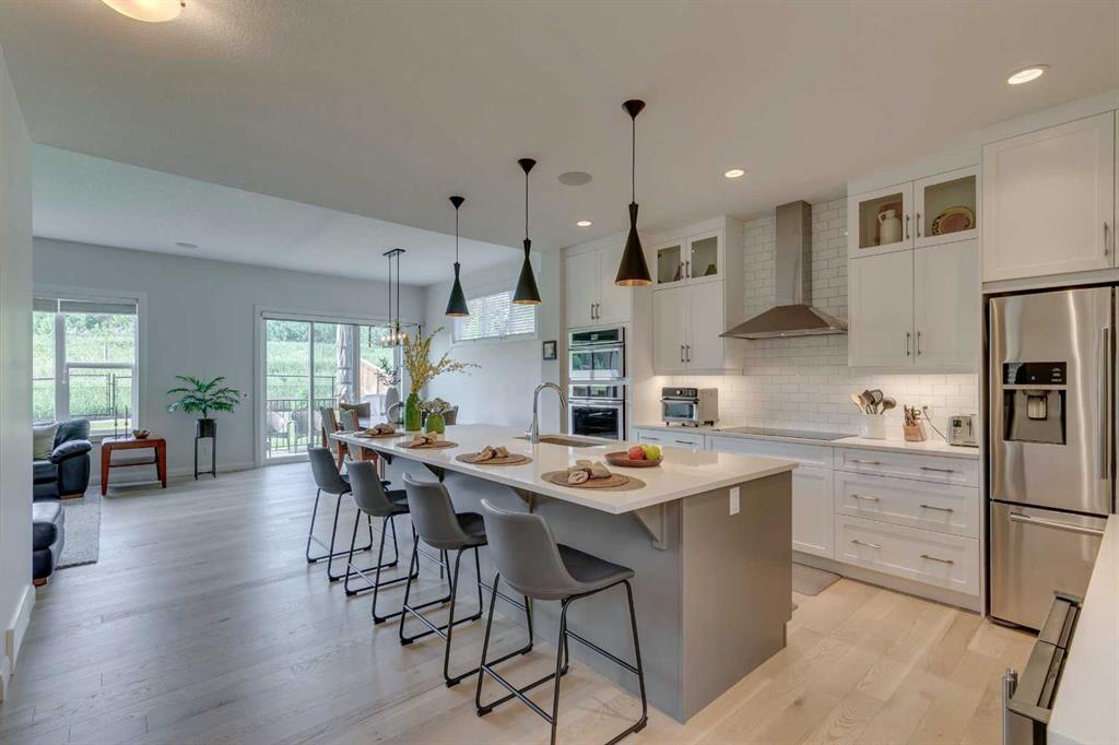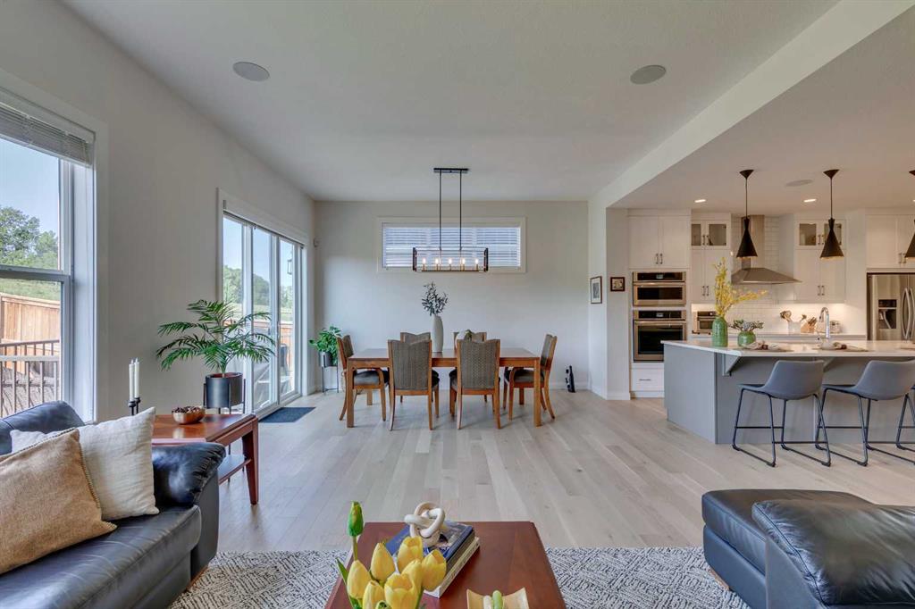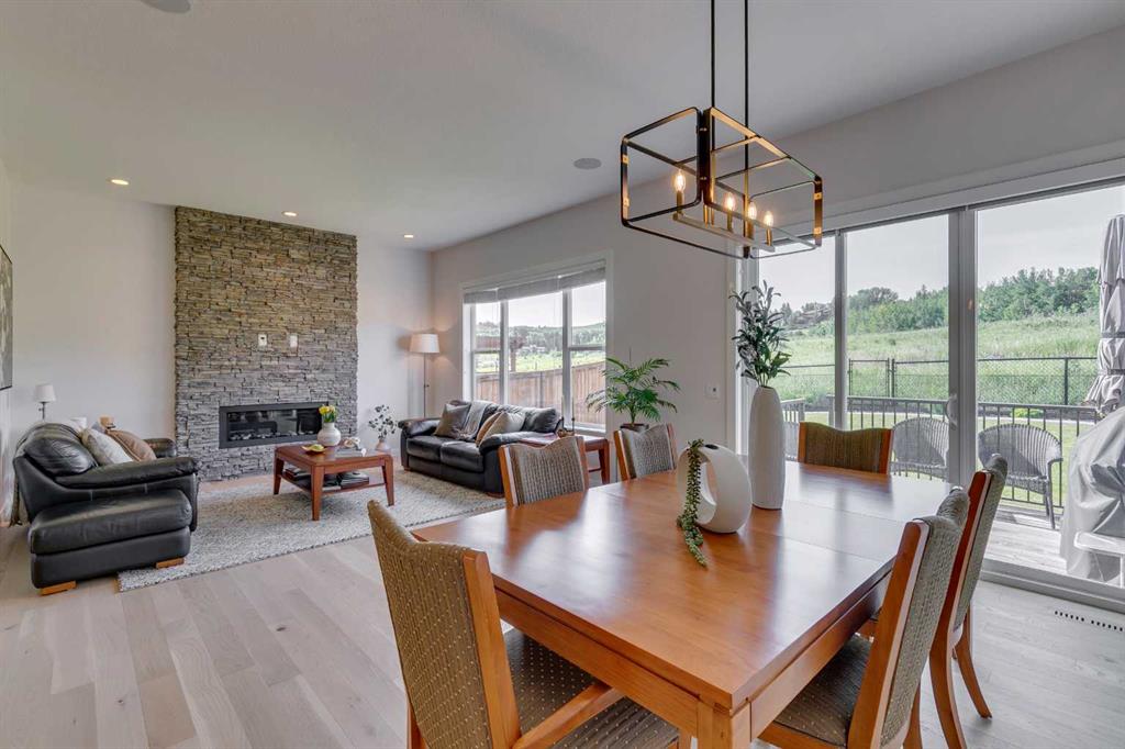 Backed by a natural foothills green space and styled with chic, airy design details, this home is the perfect balance of serenity and style. Step into a foyer with a soaring ceiling, wide plank light-toned hardwood floors and a palette of gentle neutrals, creating an inviting first impression of what lies beyond. With its open concept layout, ten foot ceiling and wall of windows framing the views to the outside, the main floor is designed for togetherness. Relax in front of the welcoming living room fireplace with stone facade. Host memorable meals in the dining room, where doors out to the deck make al fresco dining dining an effortless extension of your celebrations. At the heart of the home, the contemporary two-toned kitchen features quartz counters, subway tiles, cabinets to the ceiling, and upgraded appliances including an induction cooktop and a large central island for everyone to gather around. Whether it’s brewing your morning coffee or pouring a glass of wine with friends, the bar area with beverage fridge and wine storage is a daily luxury for your morning ritual or for serving signature cocktails. Through the reeded glass door of the pantry you can easily access the mudroom and garage, making grocery unpacking effortless. A versatile office provides a quiet retreat for work or study. At the top of the stairs on the second floor is a bright, open loft ideal for family movie nights, game hangouts or for children to play. The spacious primary bedroom is a true escape, with a sweeping view of the hillside, dual walk-in closets and an ensuite featuring double vanities, a soaking tub and a large shower. On the opposite wing, two additional bedrooms offer privacy, complimented by a convenient laundry room and a bathroom with dual sinks. The undeveloped basement contains a rough-in for a future bathroom and endless potential to customize and grow with your needs. Outside, the private south-facing yard is fully fenced, and has been thoughtfully landscaped with shrubs and a programable irrigation system. This home was built by Broadview Homes a higher calibre builder with many upgrades including light fixtures, carpet underlay, wiring, insulation, and foundation protection. Extra bonuses include: A/C, CAT6, flush-mount speakers, motorized shades, Kinetico water softener and de-chlorinator, water re-circulating system, utility sink and floor drain in garage, and radon gas exertion system. The neighbourhood is in a convenient location with easy access to Stoney Trail and the Trans-Canada making getting around the city or out to the mountains a breeze. Hiking Trinity Hills, shopping the Calgary Farmer’s Market, enjoying the year round sporting facilities at Winsport, or exploring the local pathways and parks are just a few of the great lifestyle amenities this location has at its doorstep. This is where families will gather, grow and thrive!