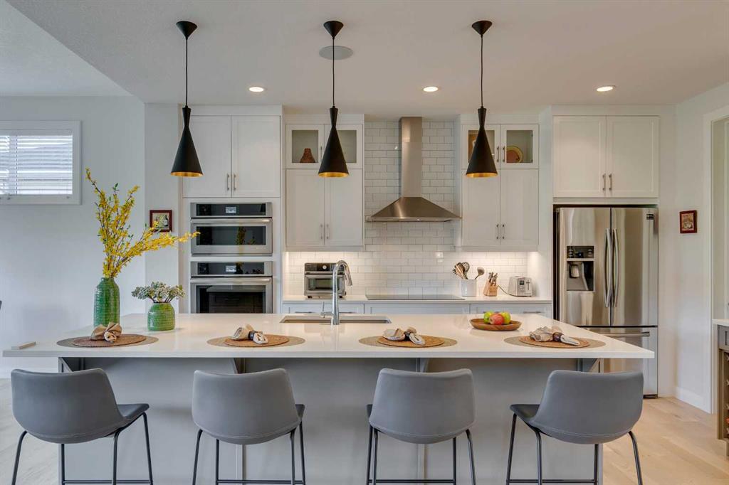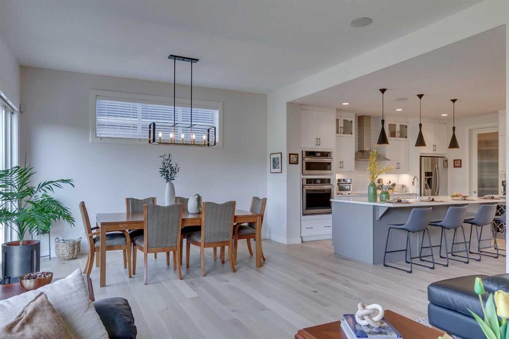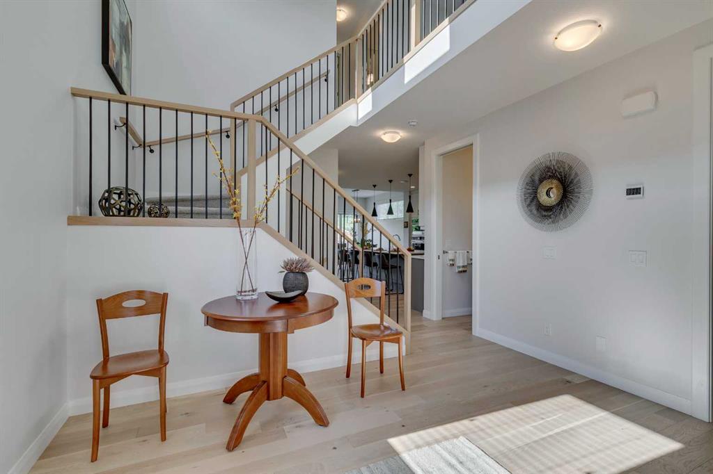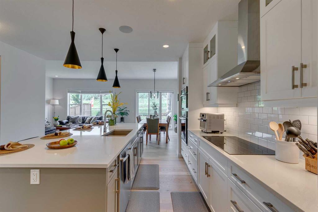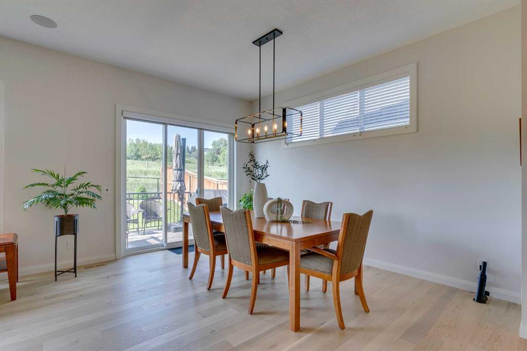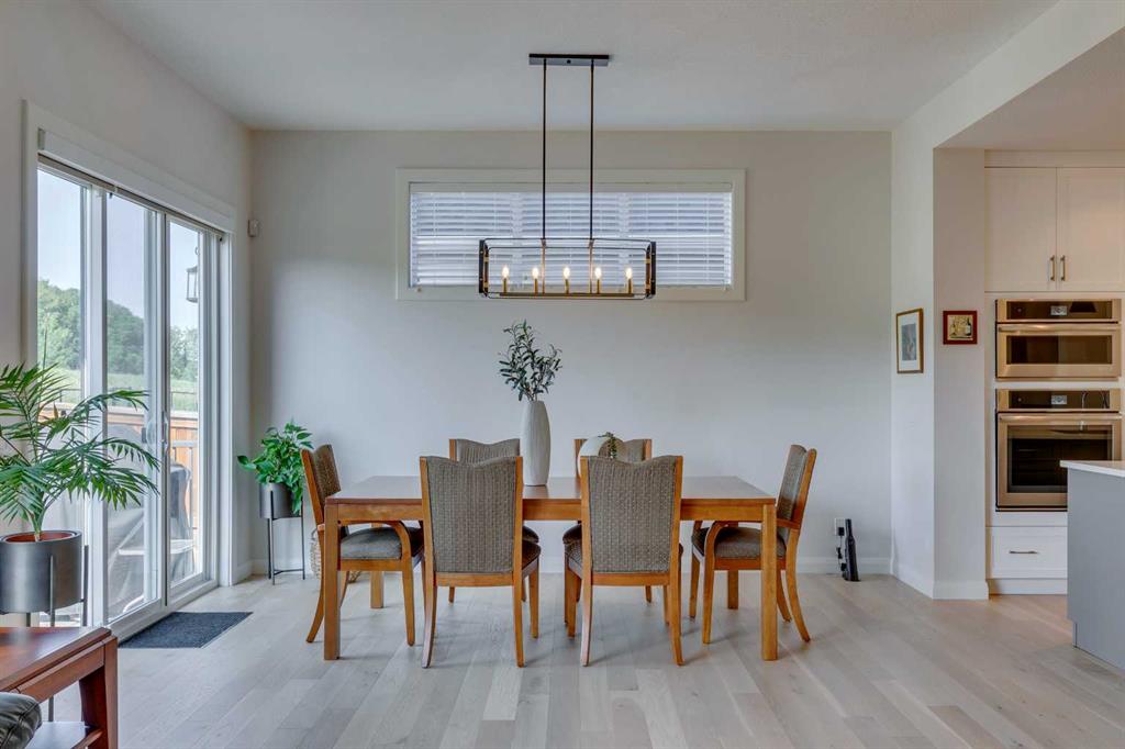 Backed by a natural foothills green space and styled with chic, airy design details, this home is the perfect balance of serenity and style. Step into a foyer with a soaring ceiling, wide plank light-toned hardwood floors and a palette of gentle neutrals, creating an inviting first impression of what lies beyond. With its open concept layout, ten foot ceiling and wall of windows framing the views to the outside, the main floor is designed for togetherness. Relax in front of the welcoming living room fireplace with stone facade. Host memorable meals in the dining room, where doors out to the deck make al fresco dining dining an effortless extension of your celebrations. At the heart of the home, the contemporary two-toned kitchen features quartz counters, subway tiles, cabinets to the ceiling, and upgraded appliances including an induction cooktop and a large central island for everyone to gather around. Whether it’s brewing your morning coffee or pouring a glass of wine with friends, the bar area with beverage fridge and wine storage is a daily luxury for your morning ritual or for serving signature cocktails. Through the reeded glass door of the pantry you can easily access the mudroom and garage, making grocery unpacking effortless. A versatile office provides a quiet retreat for work or study. At the top of the stairs on the second floor is a bright, open loft ideal for family movie nights, game hangouts or for children to play. The spacious primary bedroom is a true escape, with a sweeping view of the hillside, dual walk-in closets and an ensuite featuring double vanities, a soaking tub and a large shower. On the opposite wing, two additional bedrooms offer privacy, complimented by a convenient laundry room and a bathroom with dual sinks. The undeveloped basement contains a rough-in for a future bathroom and endless potential to customize and grow with your needs. Outside, the private south-facing yard is fully fenced, and has been thoughtfully landscaped with shrubs and a programable irrigation system. This home was built by Broadview Homes a higher calibre builder with many upgrades including light fixtures, carpet underlay, wiring, insulation, and foundation protection. Extra bonuses include: A/C, CAT6, flush-mount speakers, motorized shades, Kinetico water softener and de-chlorinator, water re-circulating system, utility sink and floor drain in garage, and radon gas exertion system. The neighbourhood is in a convenient location with easy access to Stoney Trail and the Trans-Canada making getting around the city or out to the mountains a breeze. Hiking Trinity Hills, shopping the Calgary Farmer’s Market, enjoying the year round sporting facilities at Winsport, or exploring the local pathways and parks are just a few of the great lifestyle amenities this location has at its doorstep. This is where families will gather, grow and thrive!