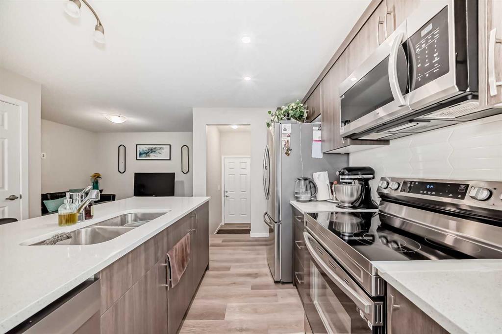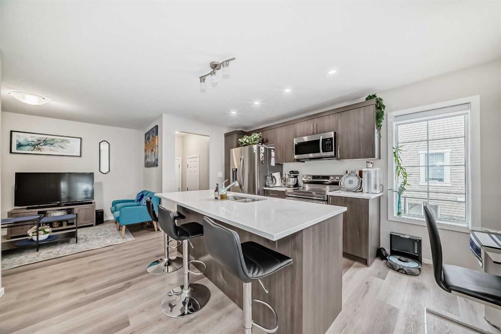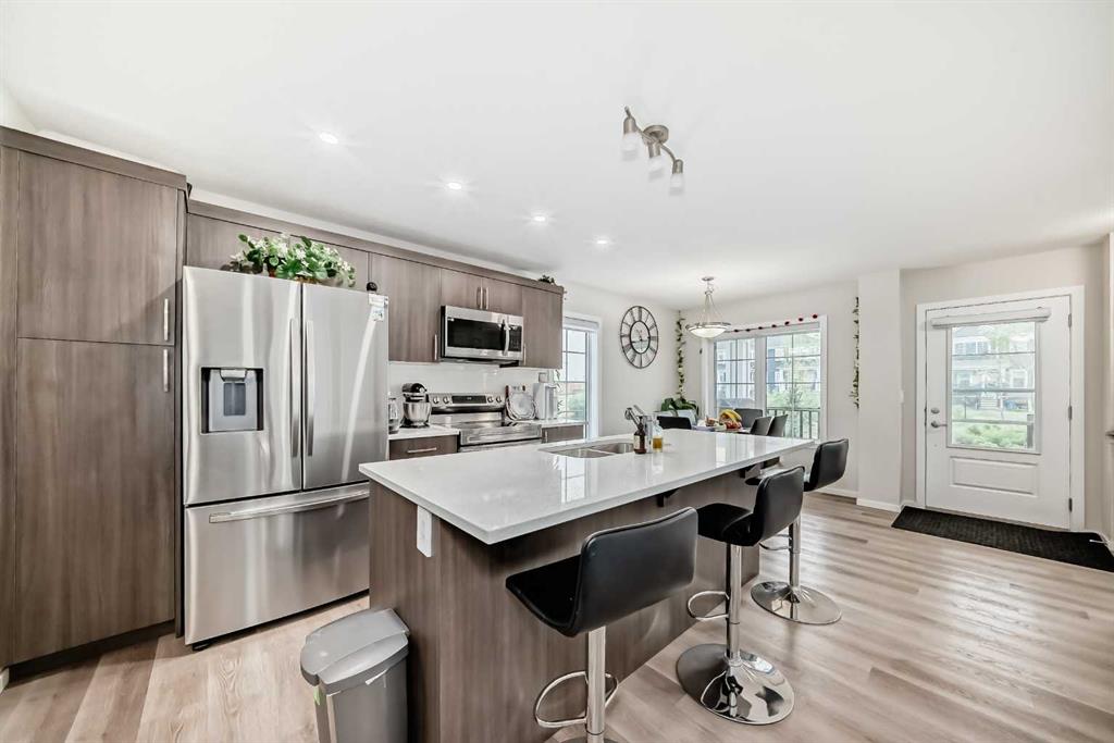 Step into a bright, open-concept main floor featuring luxury vinyl flooring, LED pot lights, and knock-down ceilings. The modern kitchen is a showstopper with premier quartz countertops, stainless steel appliances, an upgraded electric stove, chic cabinetry, and a large island with seating—perfect for family meals or entertaining.