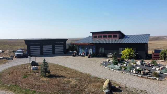 The natural landscaping around the house artfully blends with the surrounding coulees. Larger decorative shrubs add captivating texture while maintaining a seamless connection to the land, making this property a perfect sanctuary for those who appreciate modern comforts amid rustic beauty.