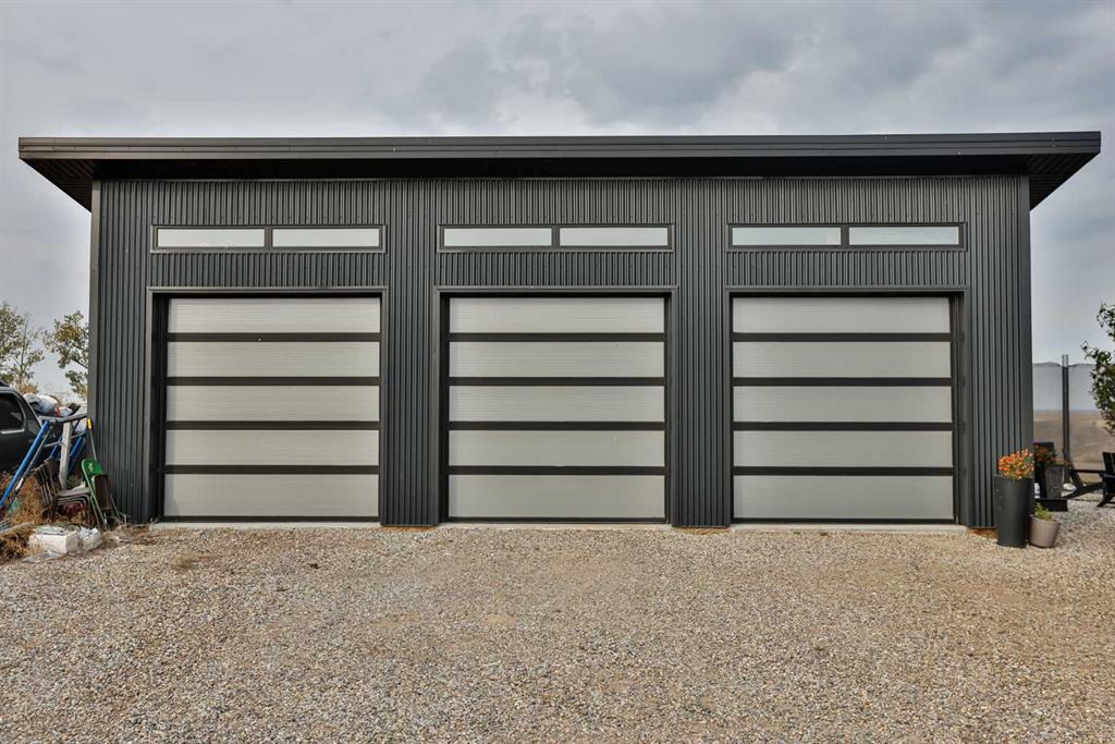 The soaring ceilings flow gracefully into the primary bedroom, a tranquil retreat with awe-inspiring views of the coulee. Elegant barn doors separate the spacious closets, the ensuite has double sinks, a large tiled shower and a thoughtfully placed window flood the space with natural light. Two additional bedrooms, divided by a stylish black metal and glass barn door, share a full bathroom featuring a generous five-foot tile shower, ensuring ample space for family or guests. Practicality meets design with abundant built-in storage right from the welcoming entrance, complemented by a laundry room and a discreet mechanical room tucked behind the kitchen. For those looking to harness the beauty of nature, the property offers access to the river. All the conveniences of modern town living are at your fingertips with in-town water. Outside, enjoy low maintenance yet eye-catching curb appeal. The exterior is finished in dark, rich colours accented with textured steel details. A detached triple-car garage spans an impressive 32 feet wide by 24 feet deep, featuring three overhead doors—one operated remotely—for all your storage and vehicle needs. Between the home and garage, a specially protected area hosts a hot tub, windscreen, and fire pit area, creating an ideal outdoor retreat.