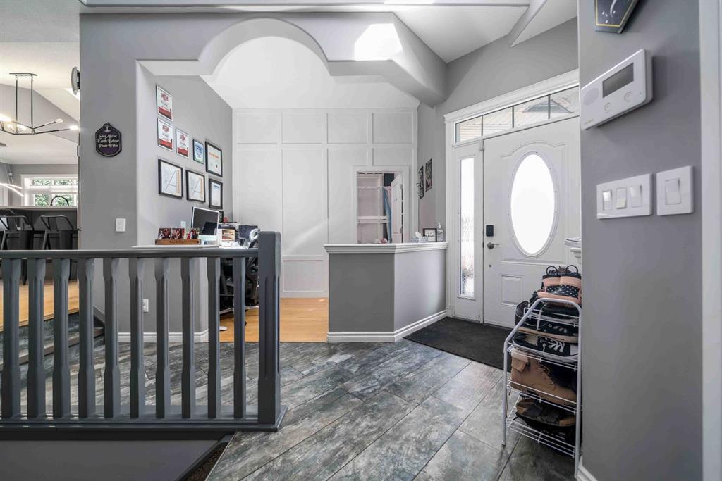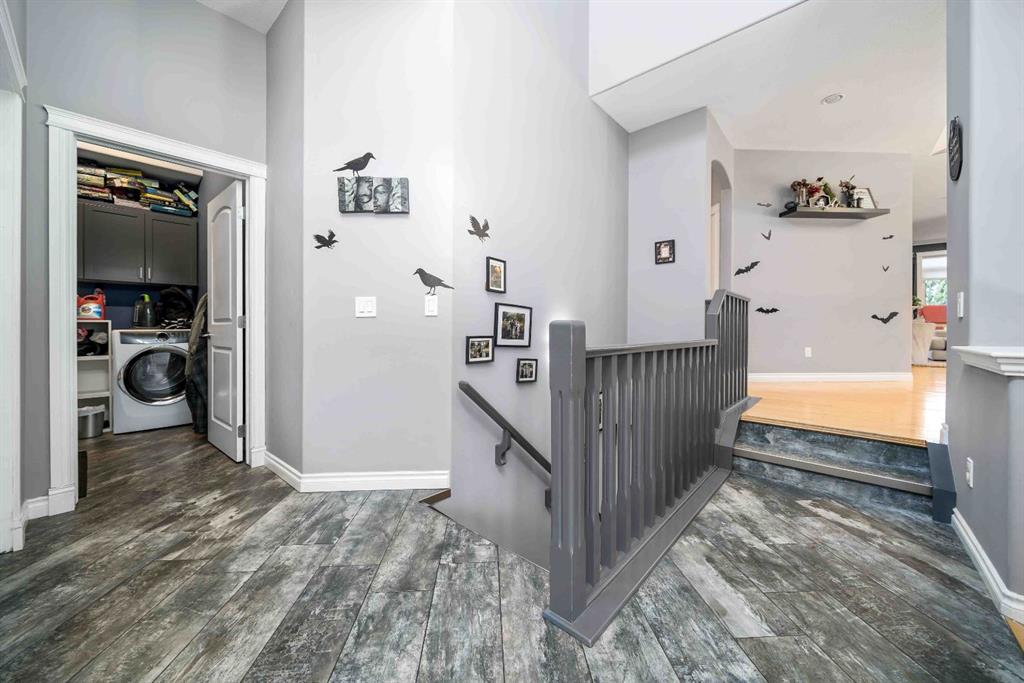 This impressive 4-bedroom bungalow with a dedicated office space, offers over 3,000 sq. ft. of beautifully finished living space! Floor-to-ceiling windows in the main floor family and dining areas, combined with skylights in the kitchen and main bath, create a home that is bright, airy, and inviting. Perfectly located backing onto a tranquil green space and just a short walk to a playground and water park, this home offers both privacy and convenience. The spacious foyer with vaulted ceilings welcomes you inside, leading to a chef-inspired kitchen featuring a large island, walk-in pantry, abundant cabinetry with unique details, updated tile flooring, and a full stainless steel appliance package (all within 3 years old). A gas hook-up is also available if a gas range is preferred. The luxurious primary suite is a true retreat, complete with a spa-like 5-piece ensuite featuring double vanities, a jetted corner tub, and a separate shower. The main floor also includes a cozy living room with a gas fireplace, a second bedroom, a 4-piece bath, and a well-appointed laundry room with a newer washer and dryer (3 years old).