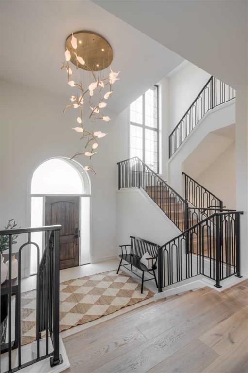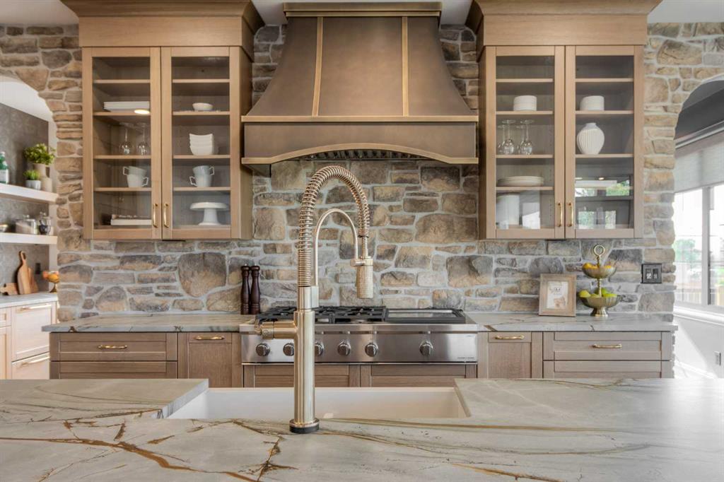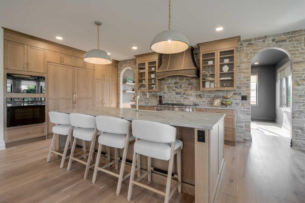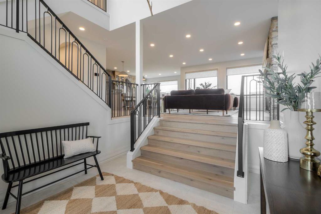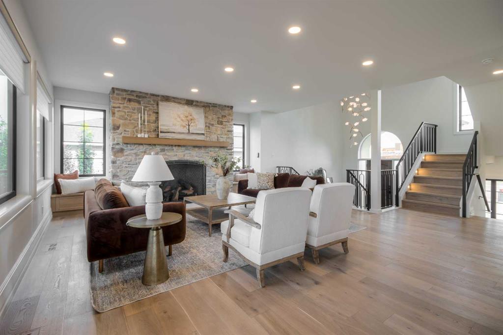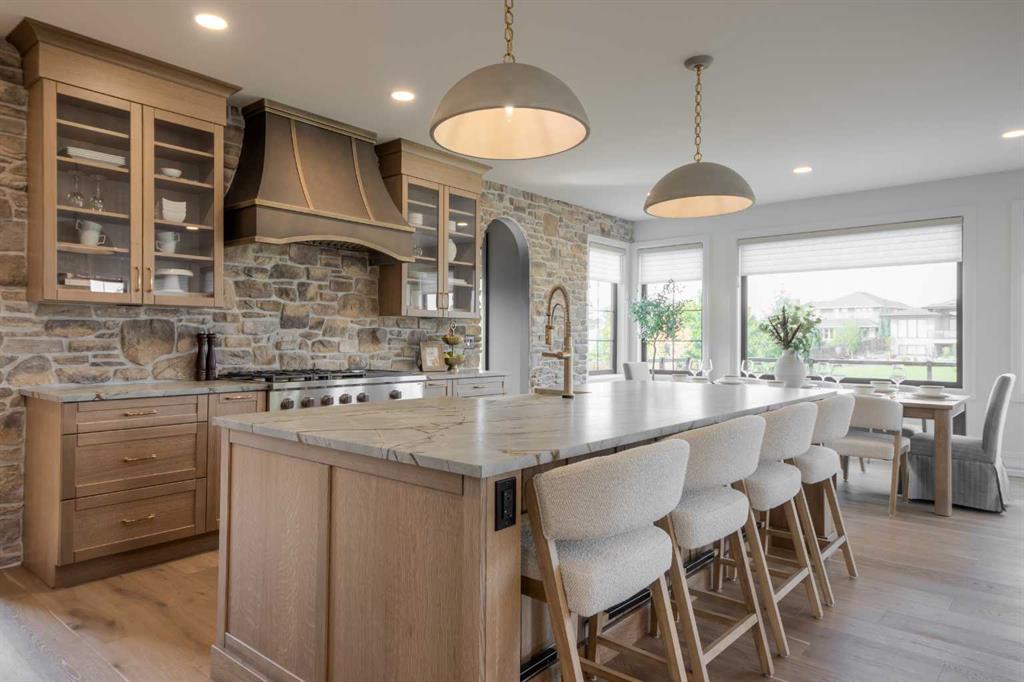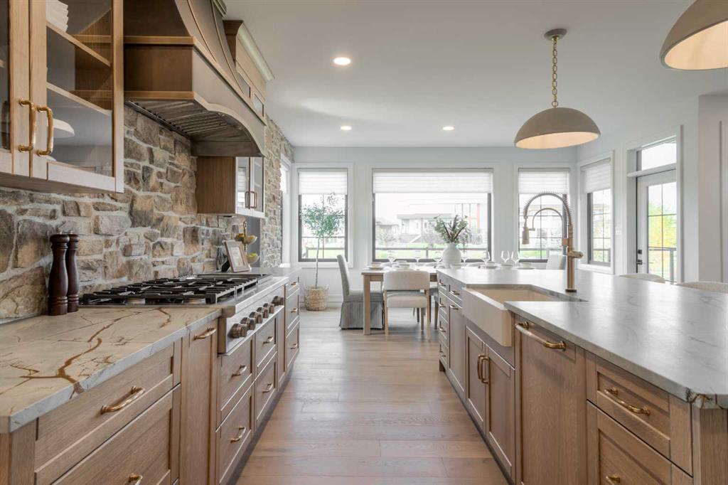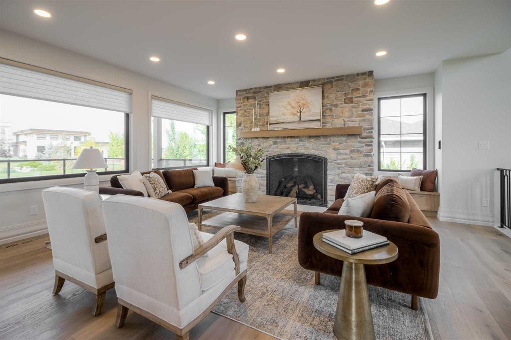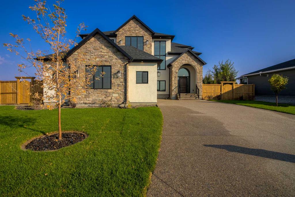 Welcome to the Meadow by Stranville Living Master Builder, located in the premier estate living community of Prairie Arbour Estates. This elegant two storey home boasts 4,417 square feet of developed area spread over three spacious levels in one of most thoughtful layouts you\'re likely to see. Where do we start? The French country exterior combines natural tones in acrylic stucco, fiber cement siding, and stone work with bold roof lines and dark contrasting windows. Large panes of high efficient glass envelope the home providing significant volumes of natural light and tranquil views of the huge yard and of Prairie Arbour\'s pond and walking paths. Fresh landscaping throughout the 1/3rd acre lot includes several trees, irrigated sod, exposed aggregate sidewalks, and a playful stone pathway to the park; all surrounded by a brand new privacy fence with two gates. Heading inside the home, the front entry foyer towers up 16\' where a dramatic chandelier sets the tone for what lies ahead. Up a few stairs into the family room, you immediately get a feel for the expansive main floor with clear views to the kitchen, dining room, and out to the back yard and the 576 square foot composite deck. The kitchen is bathed in white oak cabinetry with gold accents, and includes a premium appliance package by Fisher & Paykel, consisting of a paneled double fridge-freezer combo, gas cooktop with flat top, and wall mounted microwave and oven. More storage and counter space can be found adjacent the kitchen in the butler\'s pantry, which is finished in the same beautiful Davinci Leathered Quartzite as the kitchen. The large dining area easily seats 8-10 guests and is surrounded by glass and Hunter Douglas window coverings when privacy is on the menu. An executive style corner office that completes the main floor is drenched in dark tones and is accented by built-in shelving and even more windows. The second floor is the heartbeat of this terrific family home. The massive primary suite has an amazing private balcony overlooking the backyard and park, perfect for early mornings or late nights. Warm your feet on the heated floors of the primary ensuite bathroom, which is fitted with a lengthy double sink vanity with illuminated mirrors, a large custom tiled shower, and a sultry soaker tub. Two more large auxiliary bedrooms and a corner media room maximize the use of space on the second level. This caliber of home requires full development and Stranville Living really wanted to show what could be done with the 1,358 square feet available in the basement. Tune your game and tee up on a premium golf simulator located beside a large family room, full 4-piece bathroom, another auxiliary bedroom, and a wet bar. I could list all of the upgrades in this home, but I\'d rather you see it than read it. To fully appreciate what this home offers, you need to spend some time in it. There\'s nothing like NEW!