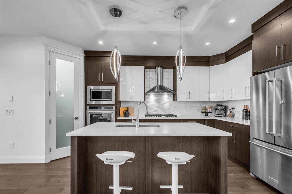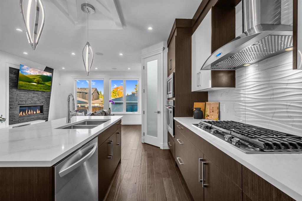 The main floor features an open-concept layout filled with natural light from expansive windows, complemented by elegant finishes throughout. The chef-inspired kitchen is the showstopper of the home—complete with quartz countertops, premium stainless steel appliances, and sleek custom cabinetry—perfect for both everyday living and entertaining.