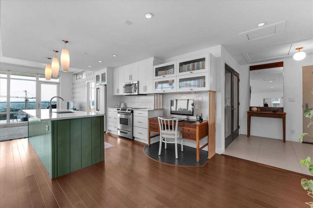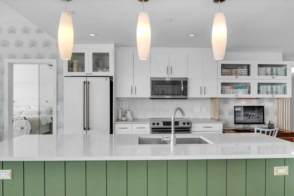 The open-concept living space has been thoughtfully updated with designer touches, including a refinished feature wall with elegant wallpaper and a beautifully transformed kitchen. Here, you’ll find freshly painted cabinetry with new hardware, a striking designer backsplash, refreshed island with shiplap accents, and upgraded appliances, including a GE Café counter-depth refrigerator. A cleverly designed desk area in the kitchen doubles as a discreet, water-resistant spot for dog or cat dishes, keeping your furry friend’s essentials tucked neatly out of the way.