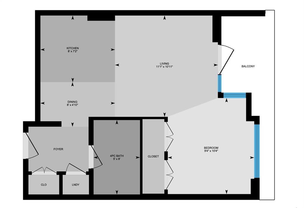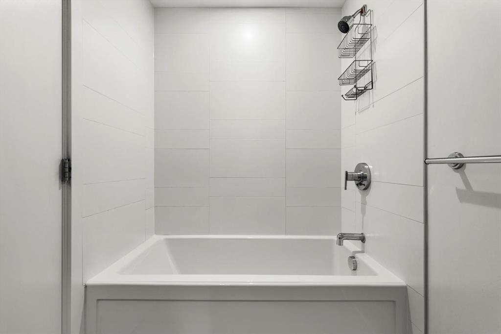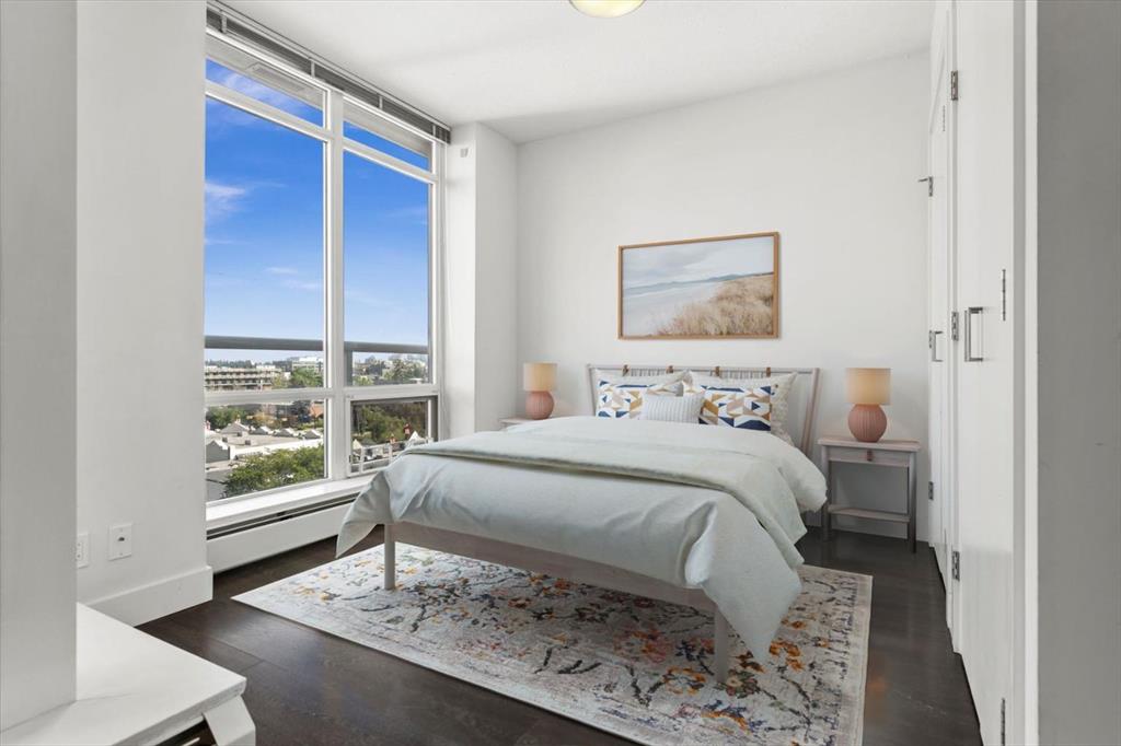 Floor-to-ceiling windows flood the space with natural light, making the open layout feel bright and airy. The sleek kitchen features quartz countertops, stainless steel appliances, and a dedicated dining area, while the living space easily accommodates a cozy lounge and TV setup. A spacious sleeping area with double closets adds functionality, and the four-piece bathroom offers granite countertops, modern finishes, and a tub/shower combo. Additional conveniences include in-suite laundry.