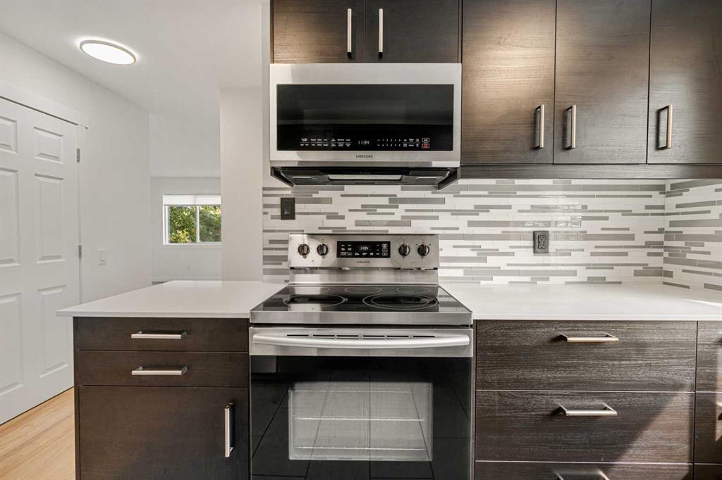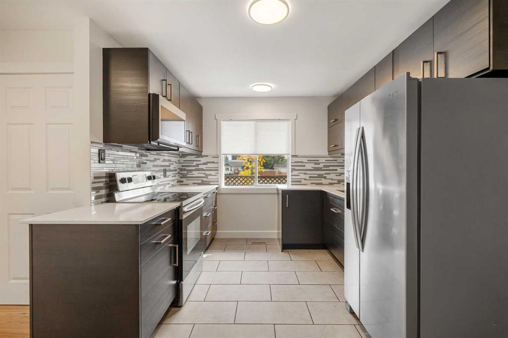 This unique property is ready for a new owner. With large square footage and an attached double garage, this home offers lots of flexibility. Entering the home, you are greeted with a huge living and dining room spanning the entire width of the house. All the windows have been replaced and the main floor has been newly renovated. The kitchen features new cabinetry, stainless steel appliances, and beautiful quartz countertops. The second bedroom features lovely garden doors out to a private deck. The primary bedroom has a cheater ensuite with a huge, tiled shower. Moving into the laundry area there is an entire wall of custom built in closets for all the storage you need. The rear of house showcases a massive sunroom/family room with extra high vaulted ceilings, a three-sided gas fireplace with stacked stone, tonnes of windows and 8 beautiful skylights. From here there is direct access to the second deck and yard as well as off street parking. Through the sunroom is the large double attached garage. This main floor is perfectly designed for roommates or a couple who works from home. In the basement is an illegal suite with its own entrance and private yard. The unit has lots of space and features a generous kitchen and dining area, a living room, a bedroom (window does not meet egress requirements), huge walk-in closet, and a 5-piece ensuite. It has never been hard to find tenants for this unit. On a corner lot, this property features an abundance of outdoor spaces which helps maintain a feeling of privacy. This cash flowing property would make an excellent addition to any investment portfolio.