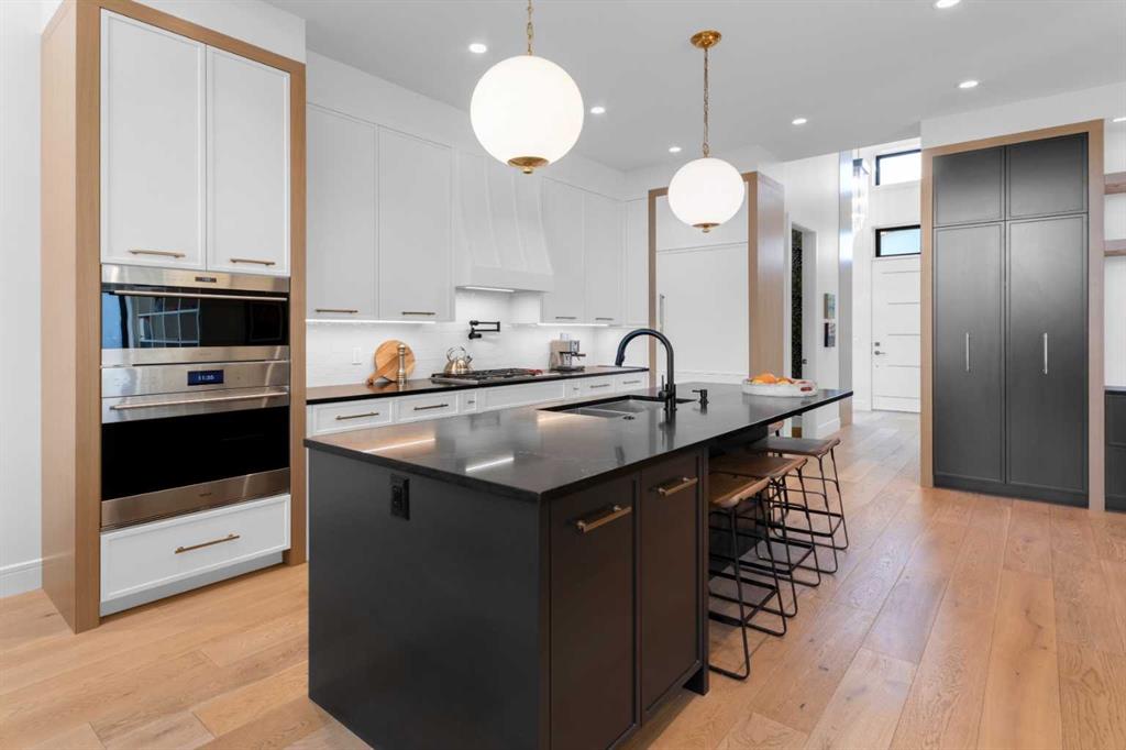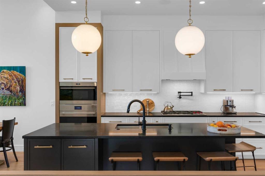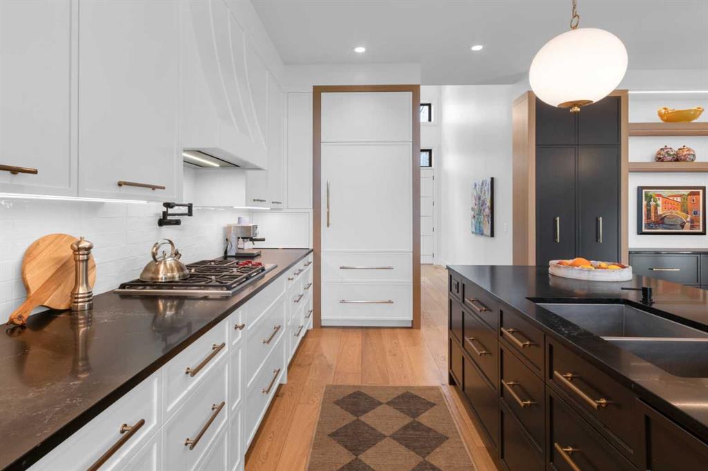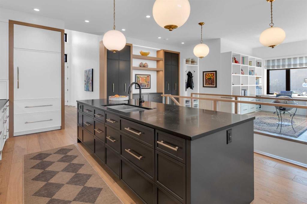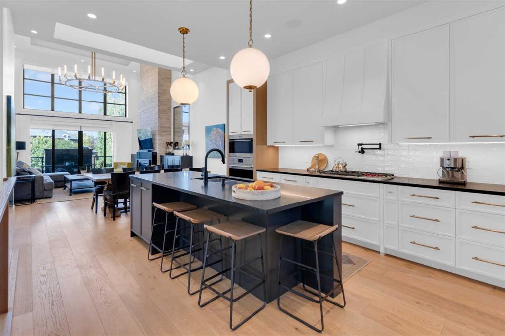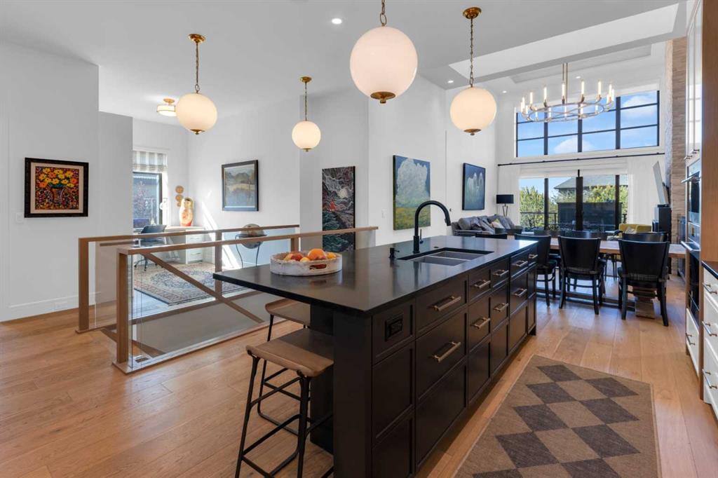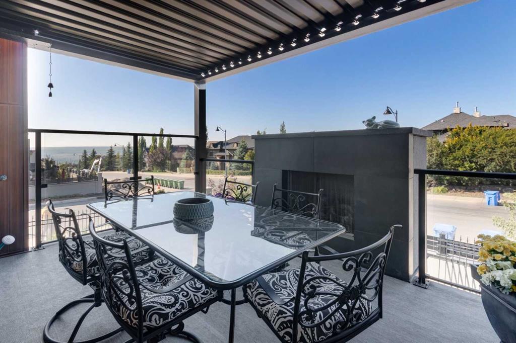 Experience refined luxury and sophisticated design in this stunning walkout villa in exclusive Elveden Court! Magnificent Rocky Mountain and Elbow River Valley views from upgraded indoor living space and surprisingly private outdoor living areas.  MAIN: Step out to a peaceful, private, glass rail deck with gas fireplace, gas BBQ, and power steel louvre pergola for sun or shade. Perfect for outdoor dining or enjoying serene sunsets with friends and family. Step in to towering 18’ vaulted ceilings, floor to ceiling windows and numerous skylights spill natural light into generous size living spaces all day. Multiple eye-catching interior architectural ceiling features even in the foyer and powder room, ideally accented by the artful collection of upmarket chandeliers & light fixtures. Substantial and impressive floor-to-ceiling brick fireplace in the vaulted living room. Large dining area and a chef’s kitchen with premium appliances, dual wall ovens, gas cooktop with wall faucet, roomy prep/breakfast island. Note the custom hardware extras to enhance function/storage. Discreetly located office with built-ins and bright window. Primary bedroom has amazing sunset views, luxurious en suite with skylights and walk-in closet. Laundry room with ample storage and mud room with easy garage access (room for lifts!) and side exit to a fenced dog run.  WALK OUT: In floor heating, large rec room with 3rd fireplace connected to peaceful covered patio (gas) and fenced grass area. 2 large bedrooms, plus dedicated gym/exercise room with rubber floors, glass wall feature wine room, wet bar and extra storage. This home was one of the first homes built in the complex, chosen for its views, corner lot privacy and the unique opportunity to work with designer Paul Lavoie to customize design choices more than the subsequent builds in the complex. Extensive and expensive upgrades plus the amazing views help make this great home truly exceptional!  Conveniently located close to Aspen Landing, Westhills, Westside Recreation Centre, walking/bike paths, multiple golf courses, major commuting routes and 69th Street LRT.  Click 3D for interactive floor plan.