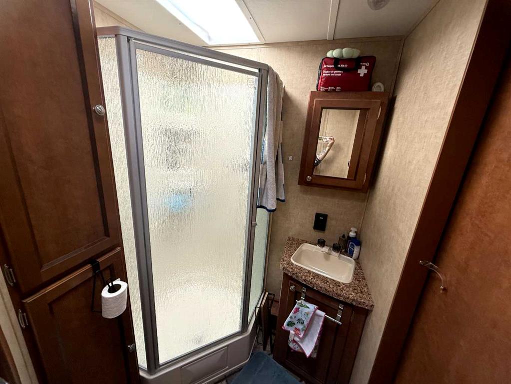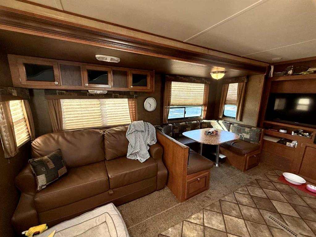 Great buy on this one bedroom 2014 Forest River trailer. Two fridges, air-conditioned, leather furniture package and large table with wrap-around seating. This ideally located, corner lot is just steps from the Marina entrance and has a huge deck overlooking a well maintained, fenced yard. The private fire pit area is perfect for those star filled Summer evenings. Plenty of parking for all the toys.