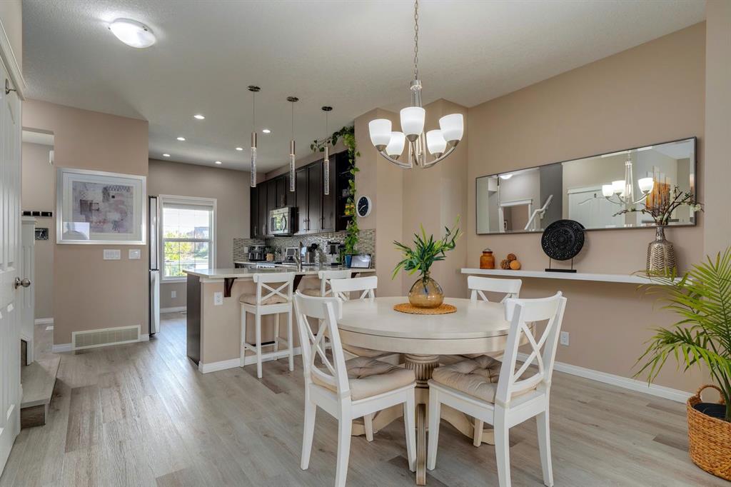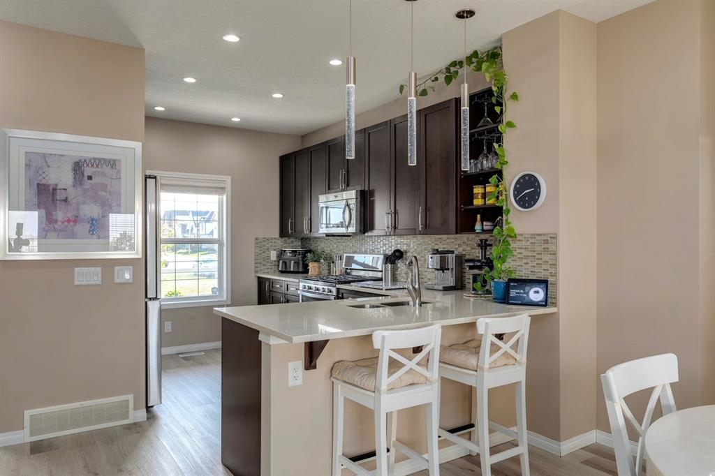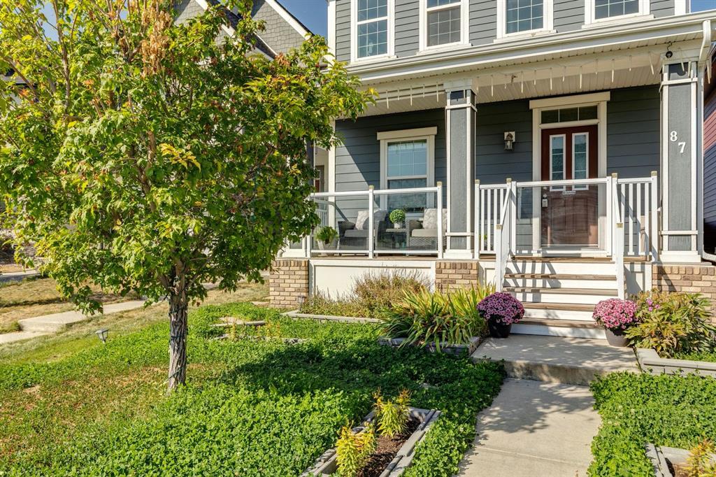 Wow! THIS IS IT! Beautifully upgraded 3-bedroom, 2.5-bath home with amazing curb appeal. Located in the sought-after Mahogany lake community, this home offers all the perks of a lake lifestyle to enjoy year-round. The eco-friendly, low-maintenance front clover lawn is complemented by perennial flowers, a custom stone wall with underground drainage, and a sunny south-facing front porch with new glass railing and sun screens, the perfect spot for your morning coffee. Inside, the chef’s delight kitchen showcases quartz countertops, a wrap-around island, pendant lighting, and upgraded stainless steel appliances including a gas stove and Samsung Smart Fridge with Beverage Centre. The open flow connects seamlessly to the dining area and cozy family room, highlighted by large backyard windows with automated blackout curtains. Step outside to your private yard with garden beds, sour cherry and plum trees, and a 20’ x 21’ concrete pad with power installed, ready for a future garage or perfect as an outdoor entertaining patio. Upstairs, the spacious primary retreat features a 4-piece ensuite and downtown skyline views. Two additional well-sized bedrooms and another full bathroom complete the level. Bonus touches include smart remote window coverings with hub control, video doorbells, and a smart thermostat. The finished basement offers a versatile recreation space with a raised removable floor currently designed as a wellness and yoga area, perfect for fitness, relaxation, or play (even a fun dance floor). If preferred, the floor can easily be removed to open up the space for a more traditional rec room layout. Laundry, storage, and a rough-in for an additional bathroom complete the lower level. For peace of mind, enjoy a new roof (2020), new vinyl plank flooring (2024), durable Hardie Plank siding, and a quiet street location. Comfort upgrades include central A/C, loads of smart features, and modern finishes throughout. Move-in ready and waiting for a new family. This Mahogany gem is a must see!
