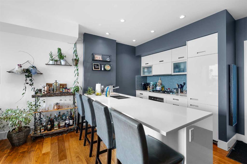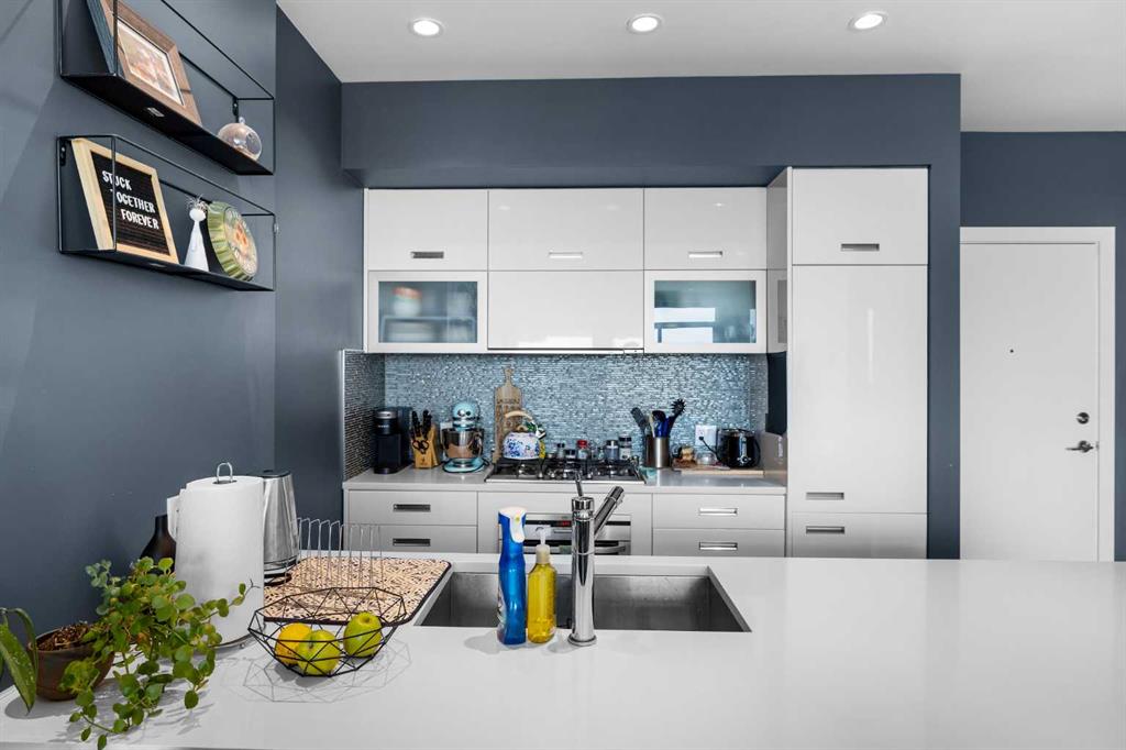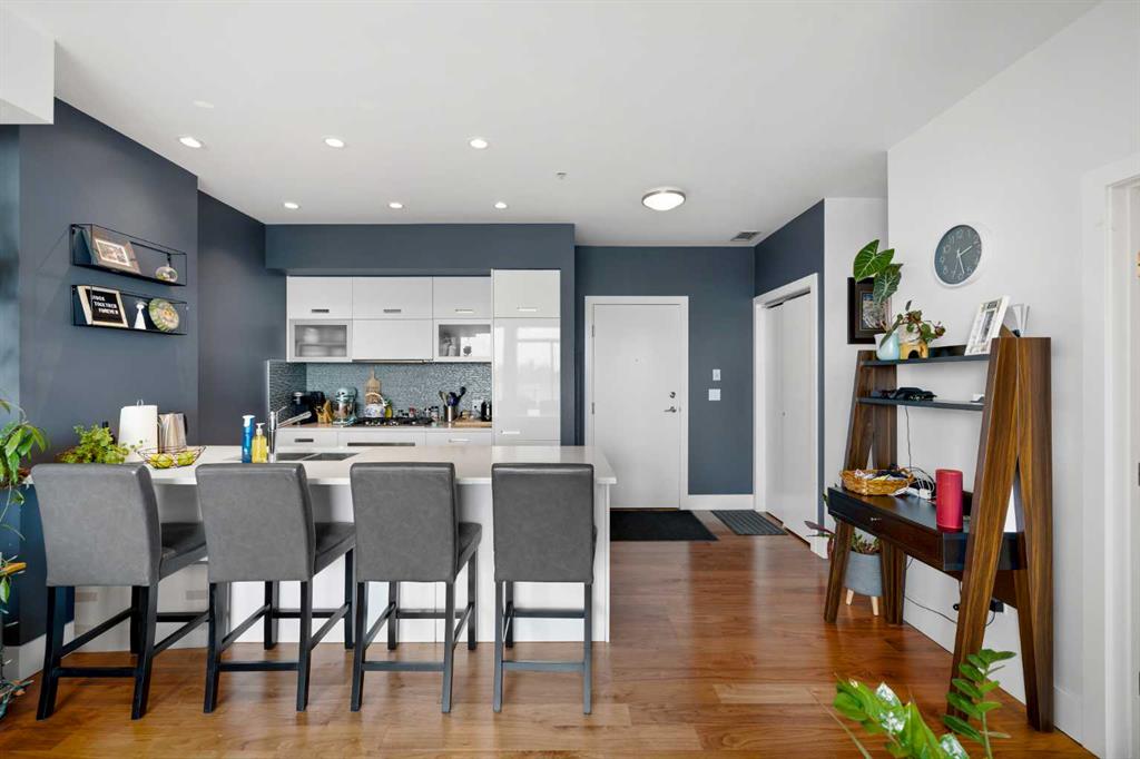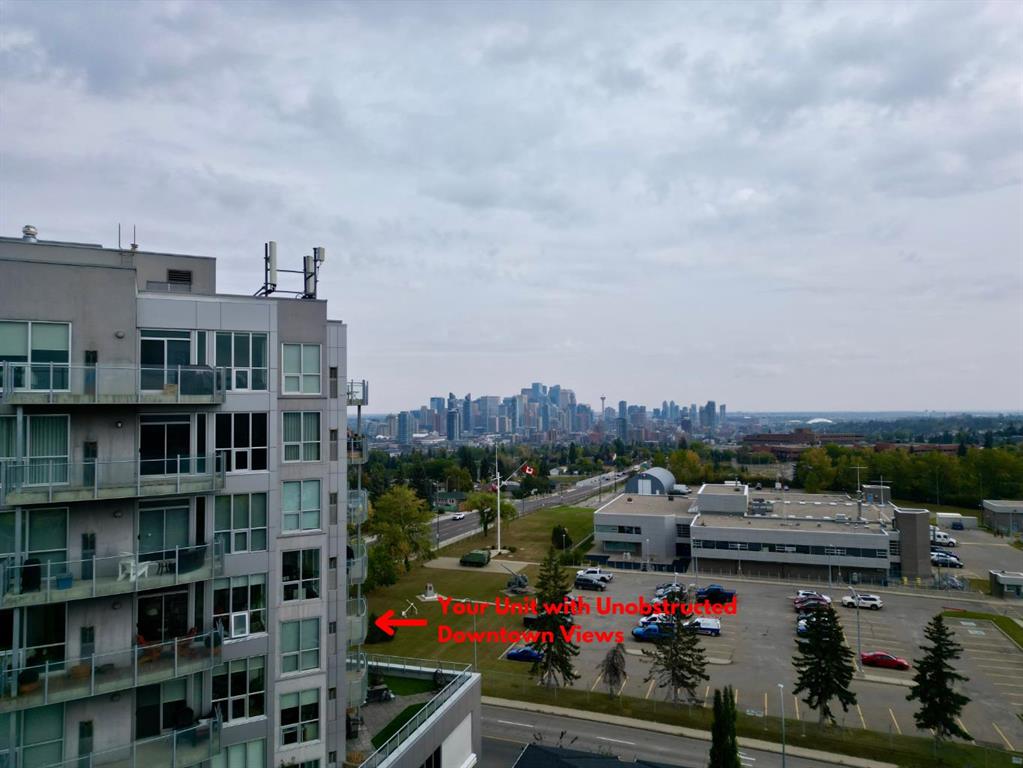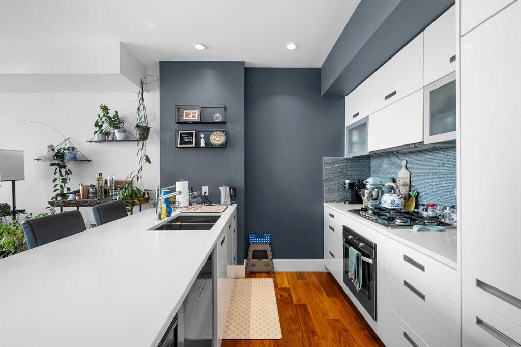 Step into modern urban living with this oversized one-bedroom unit, where floor-to-ceiling windows and an airy open-concept layout create a bright and inviting atmosphere. The spacious main foyer welcomes you into this thoughtfully designed home, leading seamlessly to the heart of the unit—the sleek and contemporary kitchen. Featuring a gas cooktop, stainless steel appliances, quartz countertops, and custom-fitted cabinetry, this culinary space is as functional as it is stylish. A convenient breakfast bar offers a casual dining option, while an adjacent area provides room for more formal dining. Beyond the kitchen, the living room is a showstopper, bathed in natural light from the expansive windows that frame stunning east-facing views of downtown. Generously sized, this space effortlessly connects to the open floor plan, offering both comfort and versatility. Step outside onto the large private deck, where the city skyline serves as the perfect backdrop for relaxing mornings or entertaining guests. The spacious bedroom, located just off the main living area, continues the theme of light and openness with its own floor-to-ceiling windows and captivating downtown views. Designed for convenience, the elegantly finished bathroom is easily accessible from both the bedroom and the main living space. This premium unit also comes with valuable extras, including a heated underground parking stall, a secure storage unit, and dedicated bike storage—ideal for urban dwellers seeking both comfort and practicality. Perfectly positioned on vibrant 17th Avenue, this residence offers quick access to the best dining, entertainment, and amenities the city has to offer. With in-unit laundry and a smartly designed layout that maximizes every inch of space, central air conditioning and the availability of fiber optic data - this modern apartment stands out with its premium finishes and unparalleled location. To top it off, buyers have the opportunity to assume a 1.79% MORTGAGE RATE until July 2026. Don\'t miss out on this exceptional inner-city home!
