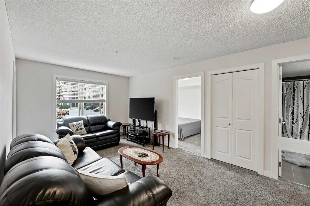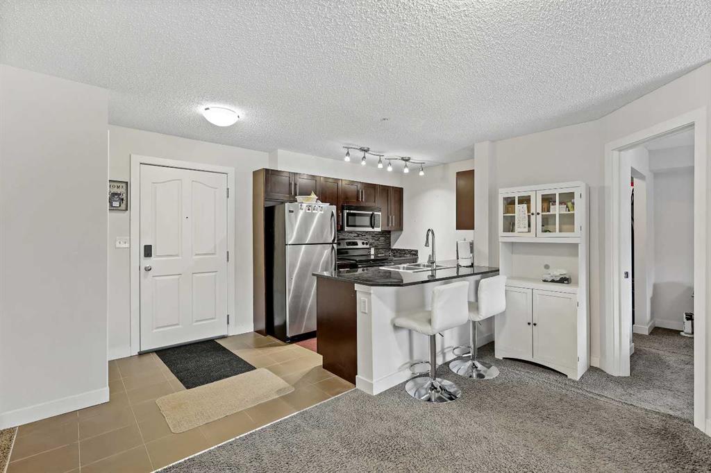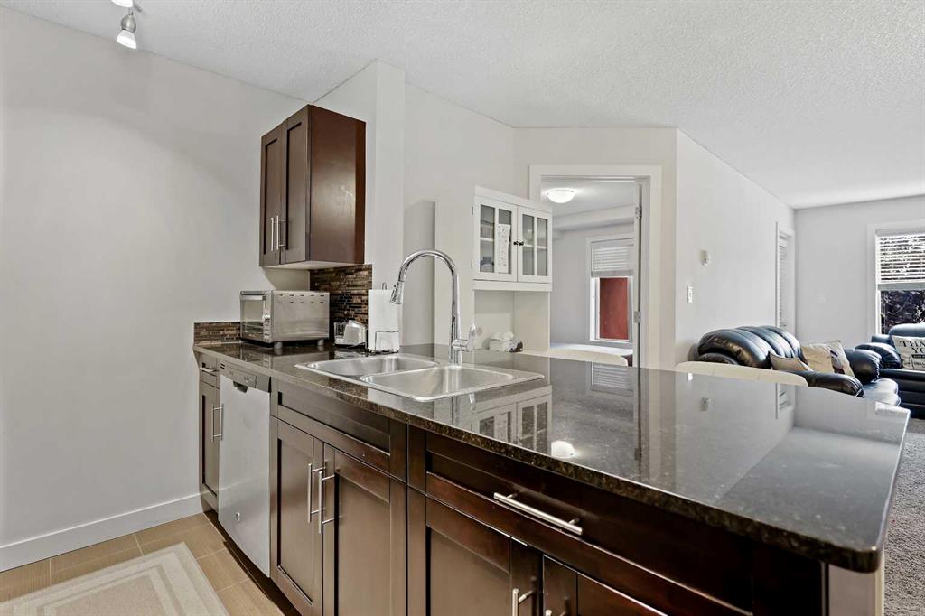 Welcome to DOWNTOWN Airdrie! This BRIGHT and SPACIOUS, 2BED + 2Bath with SOUTH exposure awaits. Step inside to OPEN CONCEPT floorplan! FLEX SPACE is perfect for home OFFICE, private dining space or STORAGE. Kitchen with lots of cabinets, GRANITE counters, stainless steel appliances, ISLAND with room for SEATING. SPLIT FLOORPLAN has primary on one side, complete with WALK-IN CLOSET and private ENSUITE. Across the living room is second SPACIOUS bedroom , 4-piece bath, IN-SUITE LAUNDRY with stacked washer/dryer, and lovely SOUTH FACING covered balcony with room for patio and BBQ. One TITLED UNDERGROUND parking spot protects your car from the elements. ELEVATOR makes this a very ACCESSIBLE option. All this in a well managed complex, WALKABLE to shopping, paths, transit and amenities.