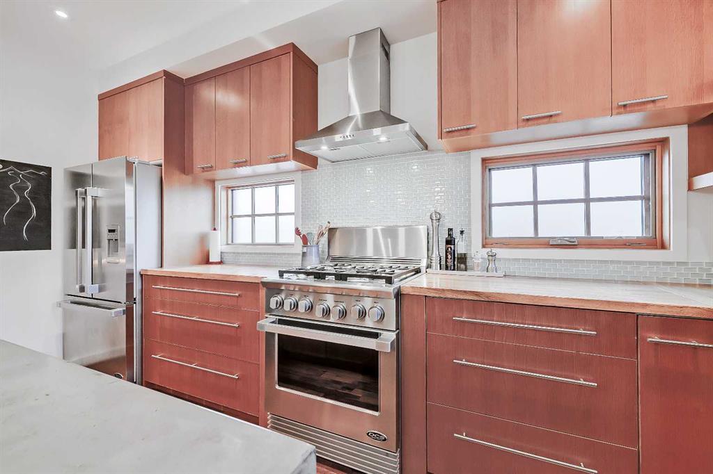Quick possession available and updated photos! Discover this stunning semi-detached home in the heart of Parkdale, offering a blend of natural design and modern amenities. Step inside to a “modern mountain cabin” aesthetic, featuring acacia hardwood floors, fir interior doors, and oversized windows that fill the main floor with natural light. The inviting living room boasts a cozy gas fireplace, while the chef’s kitchen impresses with a walk-in pantry, custom cabinetry, premium stainless steel appliances, butcher block countertops, glass tile backsplash, and a concrete-topped island with bar seating. The spacious dining area opens to the upper rear deck through French doors, ideal for entertaining.