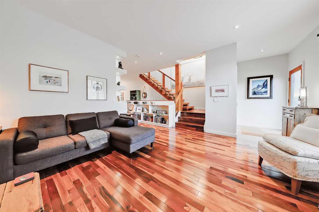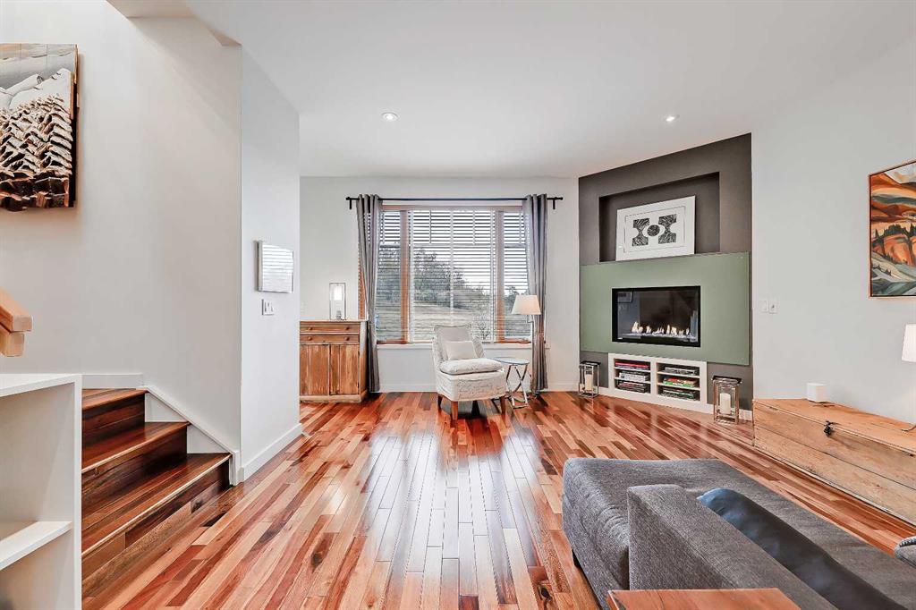 Upstairs, the primary suite offers large windows, a walk-in closet, and a barn door leading to a luxurious five-piece ensuite with dual sinks, a freestanding soaker tub, tiled glass steam shower, and heated travertine floors. Two additional bedrooms with built-in closets share a four-piece bath, and a barn-door-enclosed laundry closet adds convenience. Handcrafted barn doors throughout the home serve as unique artistic features. The fully developed lower level includes a recreation room with flexible gym space, a two-piece bathroom, and a tiled mudroom/foyer with direct access to the heated double garage. Additional amenities include Vacmuflow rough-in, snow-melt system rough-in for the driveway, and under-stair storage. Just minutes from the Bow River Pathways and transit routes, offering easy commuting to the Foothills Hospital, University of Calgary and Downtown.