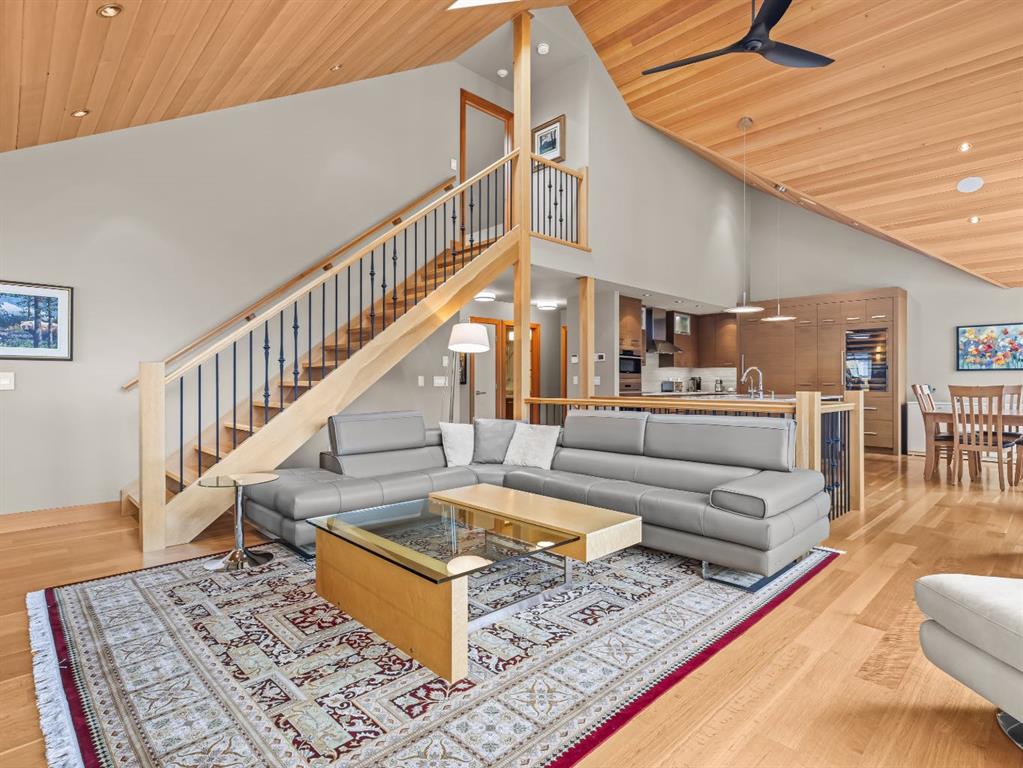 From the moment you enter, every detail reflects quality. Site-finished white oak flooring, custom solid oak, open-riser stairs, and soaring clear fir vaulted ceilings set a warm and sophisticated tone.