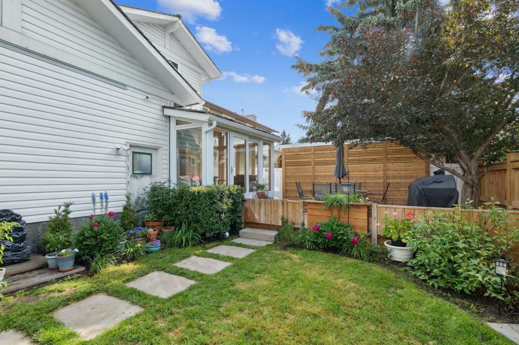 Outdoors, the south-facing backyard is landscaped with mature trees and perennials, offering privacy, seasonal colour, and space for relaxing or entertaining. Recent updates include exterior paint, garage doors, and fencing. Additional features include triple-pane windows, underground sprinklers, and a mini watering system for deck planters.