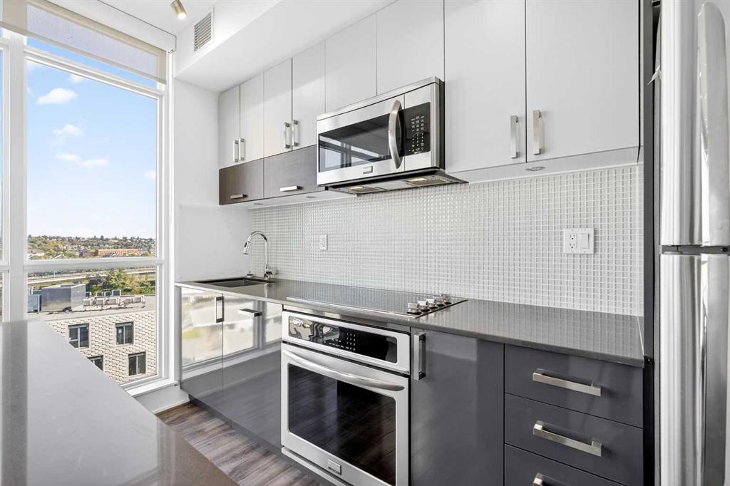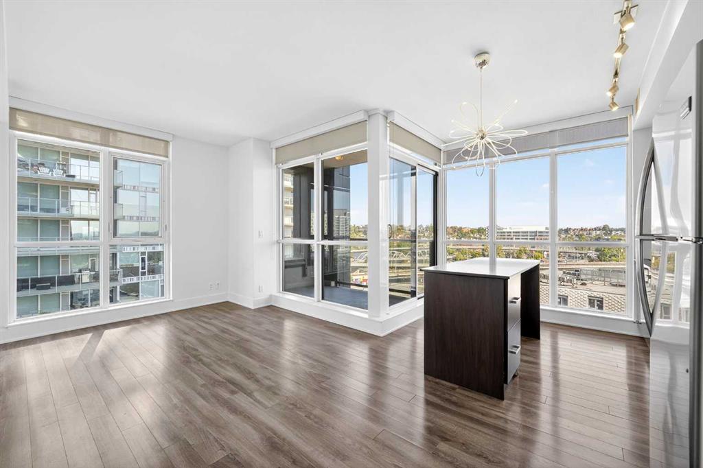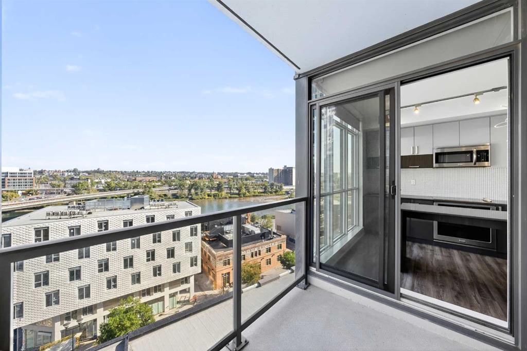 This 706 sq.ft. corner unit features 2 bedrooms, 2 bathrooms, 9’ high ceilings, and an open-concept layout throughout the Living Room and Kitchen. Floor-to-ceiling windows flood the space with natural light, while the Living Room opens to a balcony with unobstructed Bow River and city views. From both the Living Room and Master Bedroom, you can also enjoy views of the Calgary Tower.
