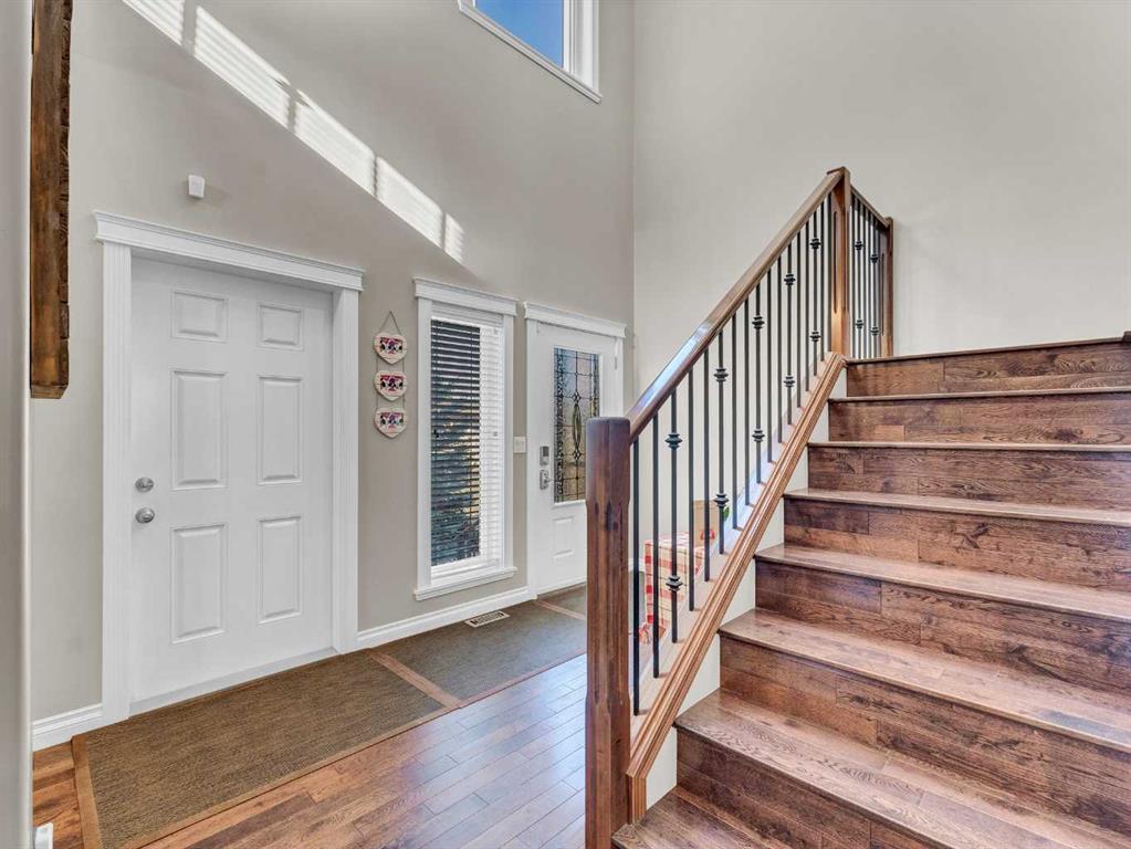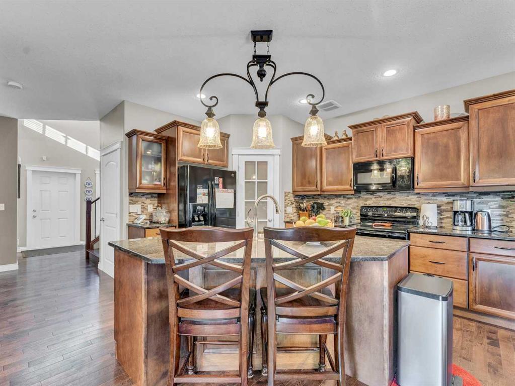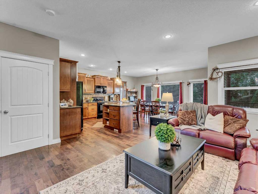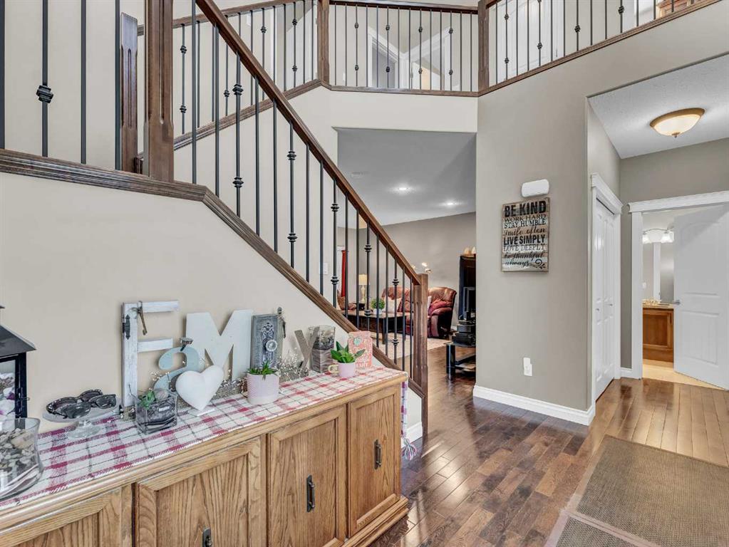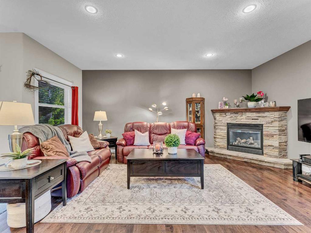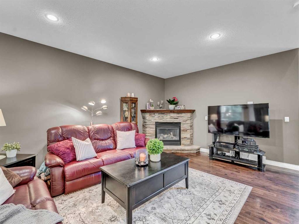 This spacious two-storey home sits on a desirable corner lot and checks all the boxes for family living — including dedicated RV/trailer parking. Step inside to find warm hardwood floors throughout the main level, paired with tile in the bathrooms and cozy carpet downstairs. The open-concept layout is designed for everyday comfort and entertaining alike. A large living room with a corner gas fireplace invites relaxed gatherings, while the kitchen shines with rich cabinetry, granite countertops, a stylish backsplash, centre eat-up island, and a corner pantry. The adjoining dining area easily accommodates a large table and opens to a covered back deck overlooking the fully fenced yard. With mature trees, a new shed, underground sprinklers, a separate dog run, and RV/trailer parking, this backyard is ready for both quiet evenings and active play. The main floor also features a convenient 2-piece powder room and direct access to the oversized heated double garage with ample storage and two man doors. Upstairs, hardwood flooring continues through three comfortable bedrooms, including a generous primary suite with walk-in closet and private 3-piece ensuite. A full 4-piece bathroom and upstairs laundry add everyday convenience. The fully developed basement extends the living space with a huge family room, large bedroom, and another 3-piece bathroom — perfect for teens, guests, or extended family. With RV parking, thoughtful design, and functional spaces inside and out, this well-kept property is truly ready for you to call home! Average Utilities are $335/month.