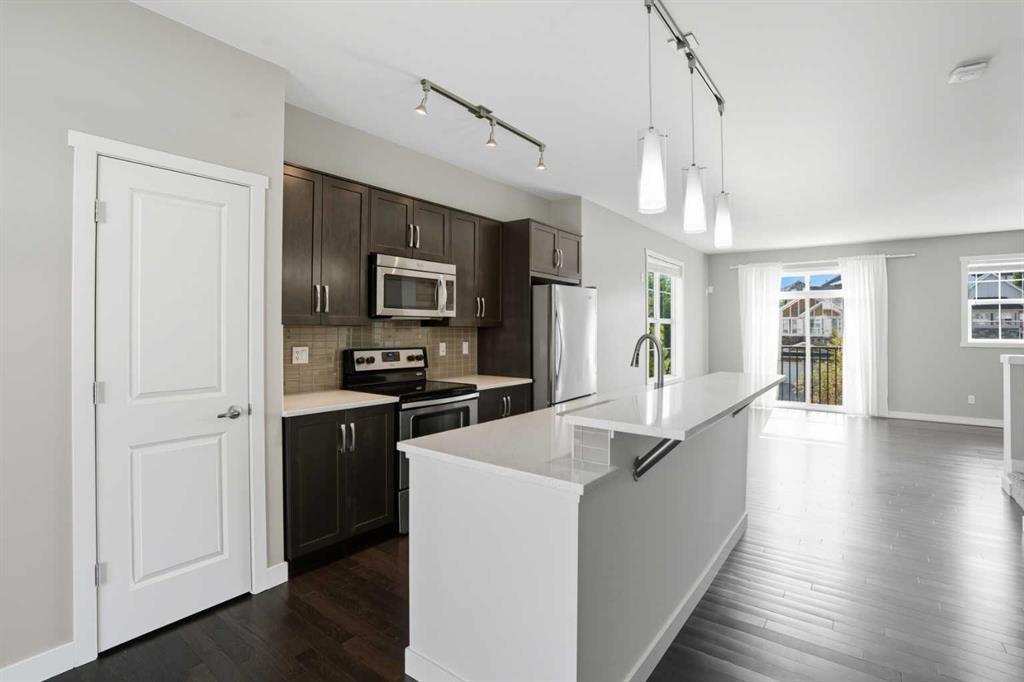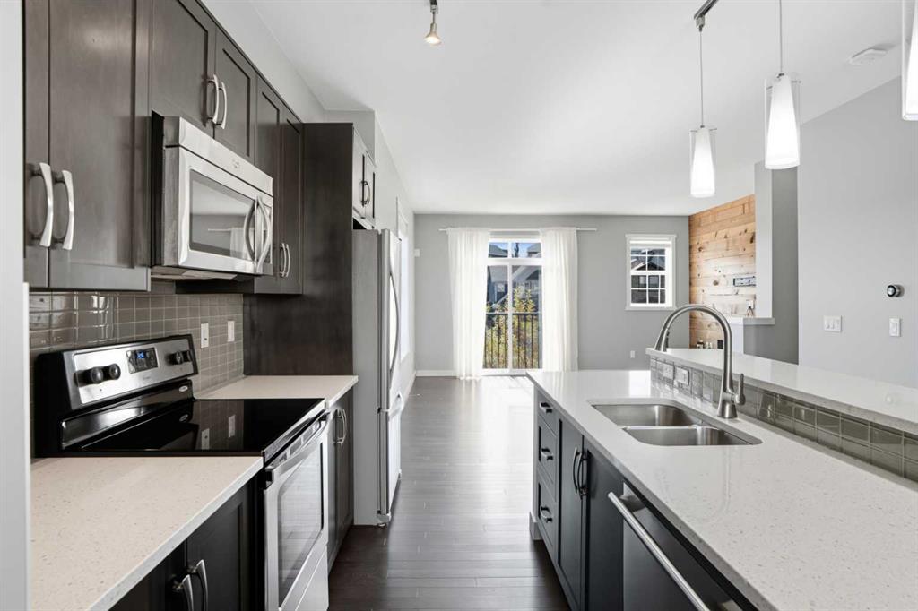 Welcome to 22 Nolan Hill Gate NW, an elegant end-row townhome that blends sophisticated design, thoughtful upgrades, and the vibrancy of one of Calgary’s most sought-after northwest communities. Bathed in natural light from oversized windows and dual French doors, the open-concept main floor centers around a chef-inspired kitchen featuring a quartz-clad island with raised bar, full-size fridge, walk-in pantry, and generous counter and cabinet space. The adjoining dining area opens to a private deck ideal for morning coffee or evening entertaining, while the living room exudes warmth with its wood accent wall, electric fireplace, and Juliette balcony. Pre-wired for surround sound, this space is ready to transform into your own home theatre experience.