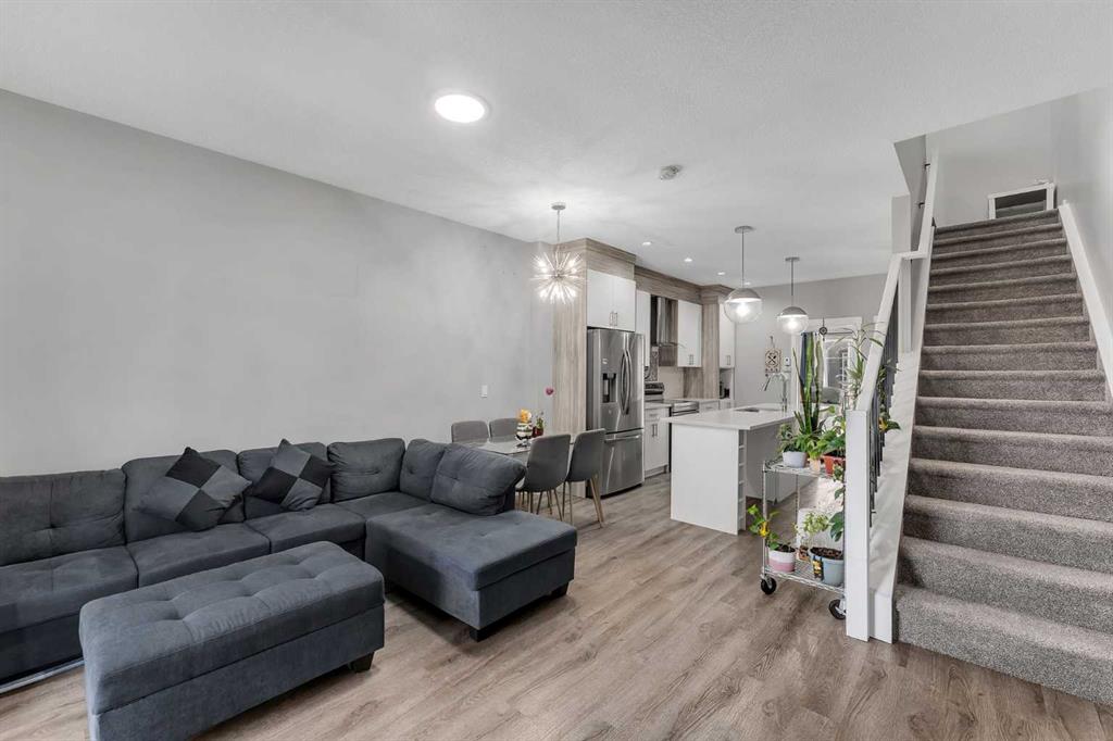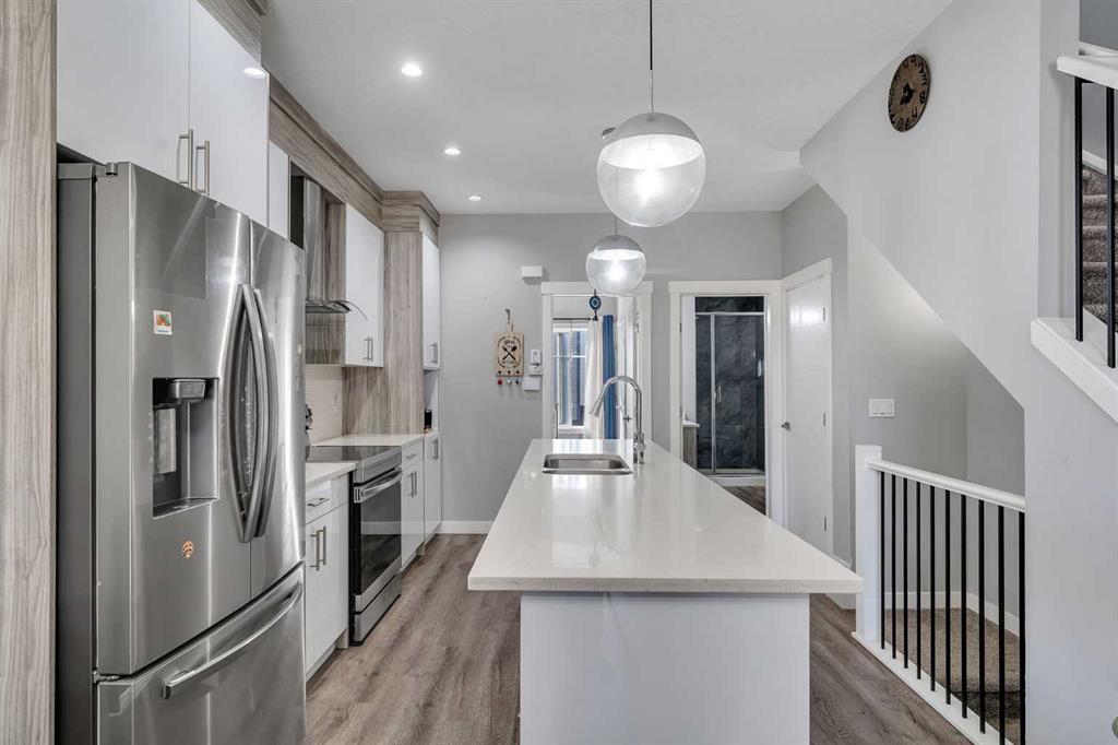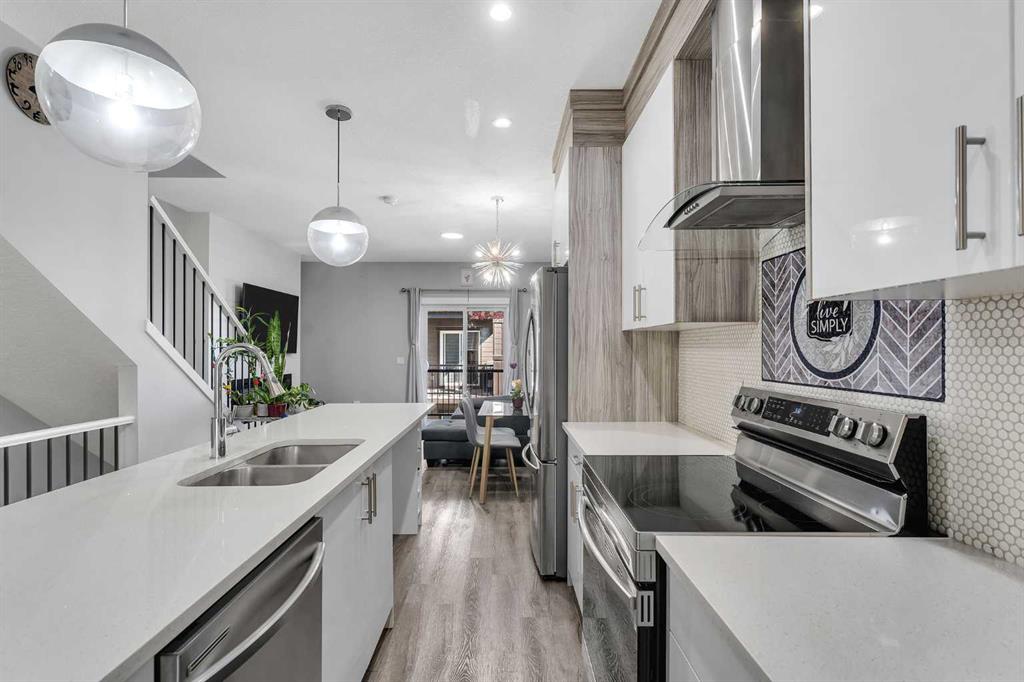 Welcome to this beautifully designed modern Townhouse with 3-BEDROOM, 3 FULL BATHROOM home with a DOUBLE TANDEM GARAGE in the highly desirable community of Skyview Ranch NE, Calgary. Perfectly combining style and functionality, this property offers an abundance of space and thoughtful upgrades throughout. The main level features a spacious double tandem garage with additional storage, ideal for vehicles, tools, or seasonal items. On the second level, you’ll be impressed by the chef-inspired kitchen, complete with glossy DUAL TONE CABINETRY, a large ISLAND WITH QUARTZ COUNTERTOPS, sleek STAINLESS STEEL APPLIANCES with a modern range hood, and plenty of counter and storage space. The open-concept living and dining area is filled with natural light from oversized windows and highlighted by a strategically placed FIREPLACE that adds warmth and character. Elegant LVP flooring enhances the modern feel, while this level also includes a bedroom and a full bathroom with a glass-enclosed standing shower, making it perfect for guests, in-laws, or a home office.