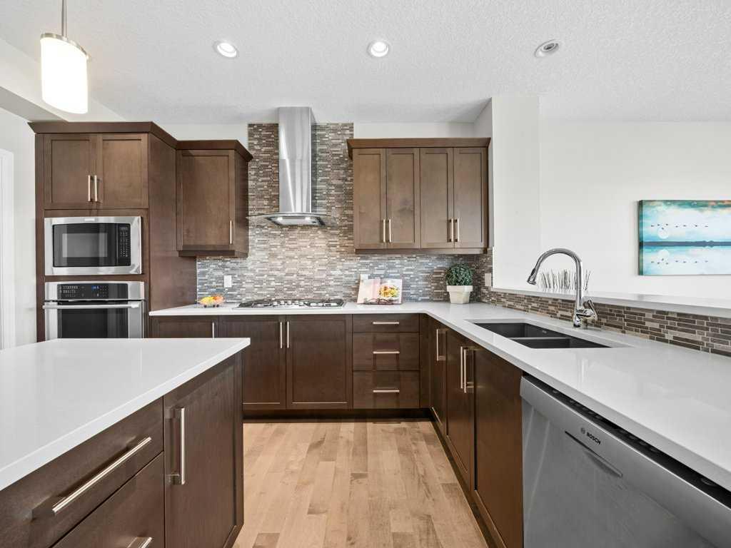 Designed for both comfort and function, this 4-bedroom, 3.5-bath home blends timeless style with modern convenience. The main floor features 9’ ceilings, engineered hardwood and ceramic tile, a warm gas fireplace, and a chef-inspired kitchen with maple-stained shaker cabinets, quartz counters, built-in oven and microwave, brand new fridge, and water softener. Custom window coverings (adjustable top and bottom) allow you to control light while enjoying serene views and no neighbours behind.