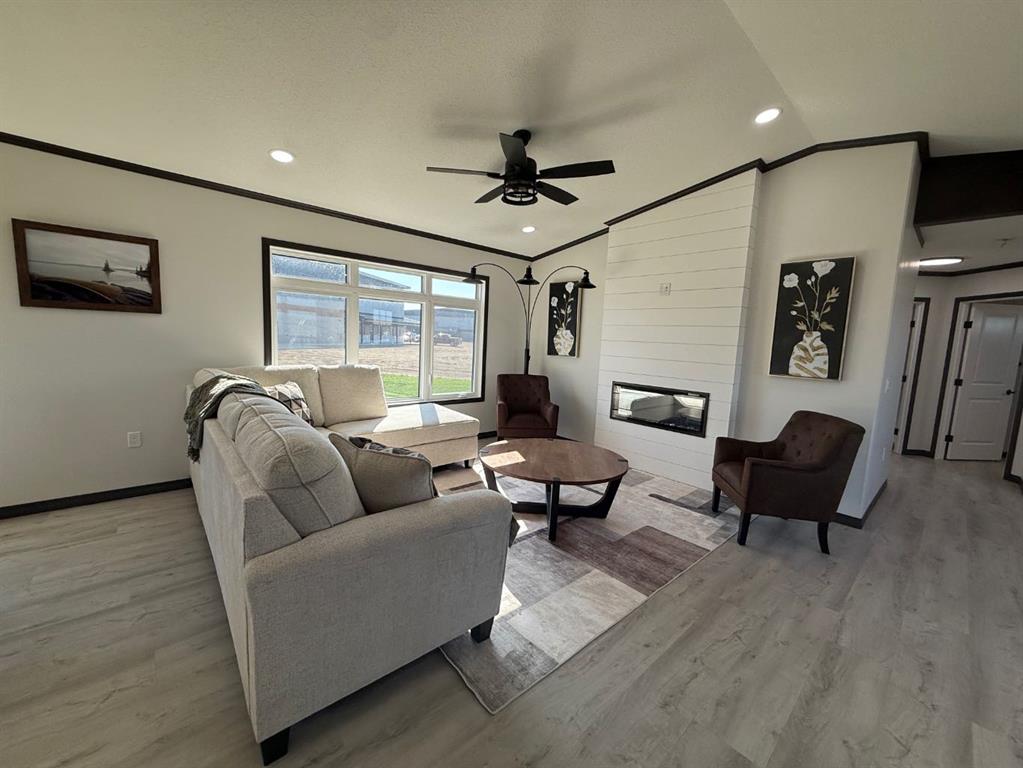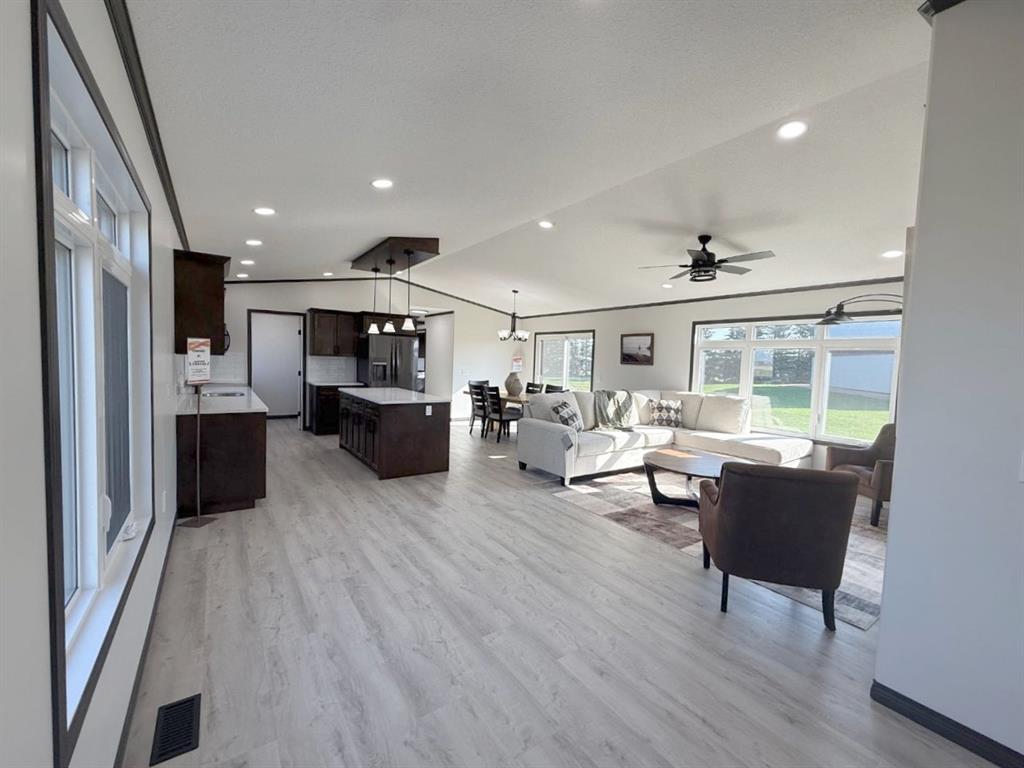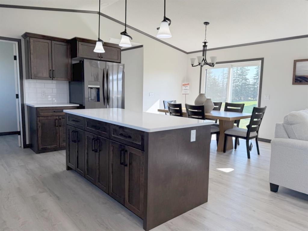 Introducing a brand-new home, crafted with style and quality, ready to move to your acreage or residential lot! This 1672 sq/ft. Pinnacle, built by Horizon Home\'s showcases grand design, phenomenal options, and the kind of high caliber build that sets it apart. The photos shown are of a fully staged show home — the home available for purchase will be similar in layout, though finishes may vary. The heart of the home is a chef’s delight kitchen featuring a walk-in pantry with built-in shelving, a massive island, high-quality cabinetry, and quartz countertops that combine beauty with functionality. The kitchen flows seamlessly into the dining and living space with vaulted ceilings, a built-in fireplace, and oversized windows flooding the area with natural light. A rear patio door makes it easy to step outside and enjoy the outdoors. The primary suite is a true retreat with a huge walk-in closet and a 5-piece ensuite featuring a soaker tub, full tile shower, and double sinks with fantastic finishes. A second bedroom sits conveniently nearby, while two more spacious bedrooms are located at the opposite end of the home — ideal for family or guests. Horizon Homes are built to the highest standards with top-notch materials, and unmatched attention to detail. They offer turn key acreage and residential lot mobile home set ups. Reach out today to learn how this model — or one built just for you — could be yours!