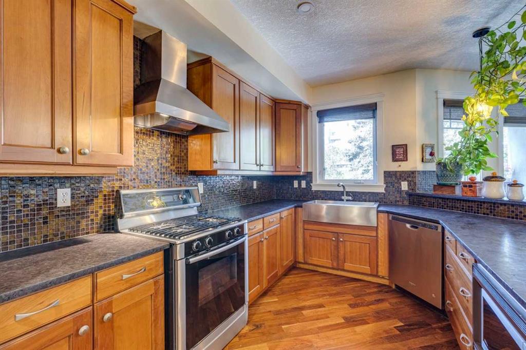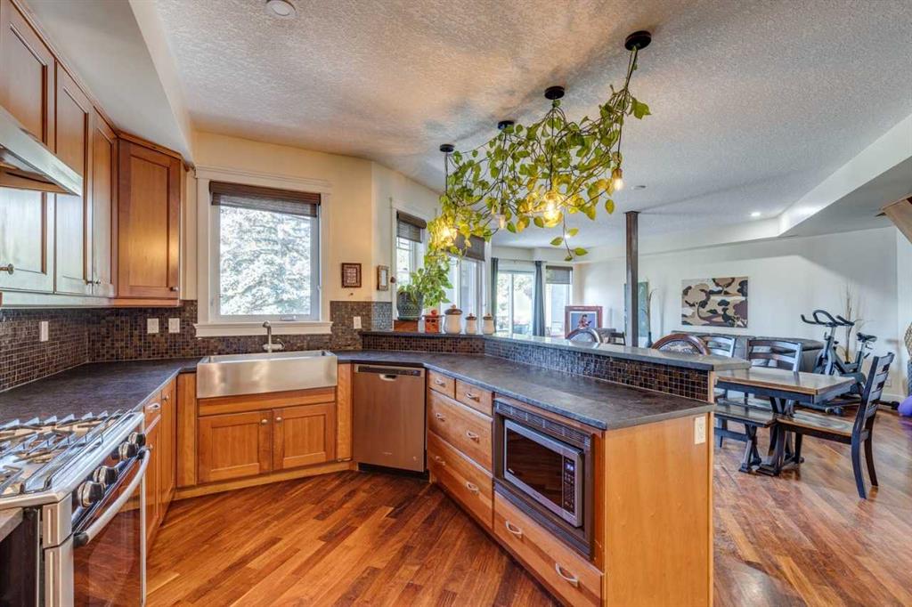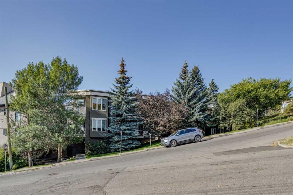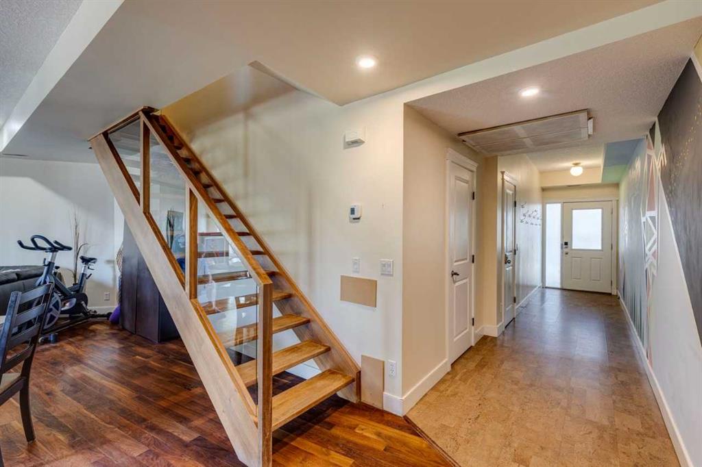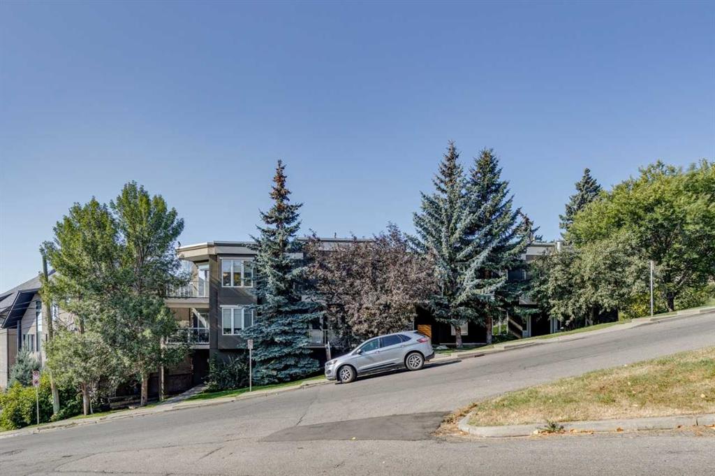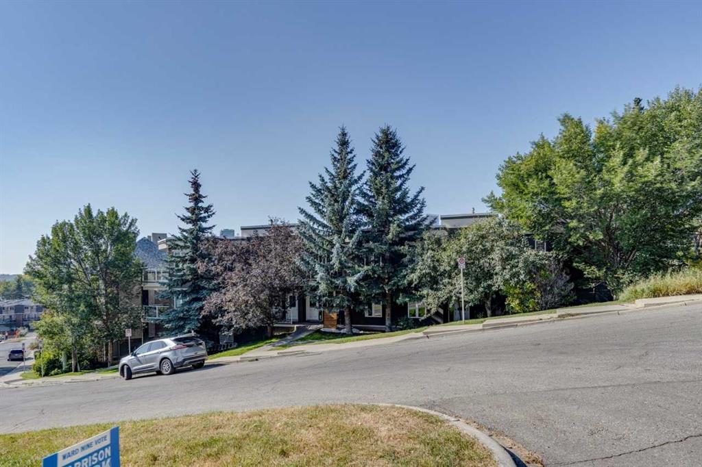 This stunning 2-storey townhome (1,491 sq. ft.) offers modern architecture, open-concept design, and timeless style—all highlighted by rich walnut hardwood floors. A true inner-city retreat in a trendy, established community, this home delivers a maintenance-free lifestyle with spectacular downtown views from three balconies. Step inside and discover a bright, open living space perfect for entertaining. The gourmet kitchen boasts abundant cabinetry, granite countertops, stainless steel appliances, and a huge breakfast bar—ideal for the home chef. Summer evenings are made for BBQs on the two rear decks overlooking the green space and city lights. The dramatic copper-inlaid fireplace is the centerpiece of the large living/dining area, while a convenient 2-piece bath completes the main floor. An architecturally striking floating staircase leads to two spacious bedrooms, each with its own ensuite. The luxurious primary bedroom is a true retreat, featuring glass French doors, a double-sided fireplace, a spa-inspired ensuite with a freestanding soaker tub beneath a chandelier, a walk-in shower, and ample closet space. The second bedroom also includes its own private 3-piece bath—perfect for guests. Just steps to shops, cafés, and restaurants, with easy walkability to downtown, this vibrant area truly has it all. Parking is located in the underground garage, or permit parking on street.