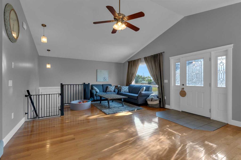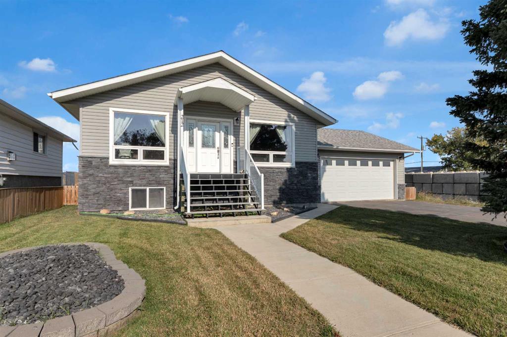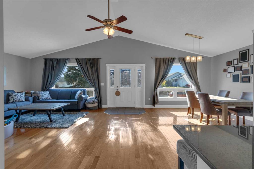 Welcome to 212 3rd Street North in the Town of Vulcan! This bright and beautifully built bungalow, constructed in 2015, sits on a spacious 65’ x 115’ lot near parks, outdoor recreation facilities, and more. The main level offers an open-concept design with a living room, dining area, and kitchen—perfect for entertaining or enjoying family time. The kitchen includes granite countertops, a gas stove (new in 2025), a lower-height island with electrical outlets designed for baking comfort, and plenty of cupboard space. Bruce hardwood floors add warmth and style throughout the main level. Two bedrooms are also on this floor, including the primary, along with a conveniently located stacking washer and dryer (washer new in 2025). The developed basement has been recently updated with new paint and flooring, and features a huge family room, two additional bedrooms, a full bathroom, storage, and utility rooms. Comfort is a priority with in-floor heating in both the basement and the attached double-car garage. The garage includes a large 8’ x 18’ door, while the paved driveway provides easy access. Outside, the property is nicely landscaped front and back, with a partially fenced backyard that includes room to park your RV. Additional updates include a boiler installed approximately three years ago. Please note there is a local improvement tax of $292.48. This home is move-in ready and combines modern convenience with thoughtful design—don’t miss the chance to make it yours!