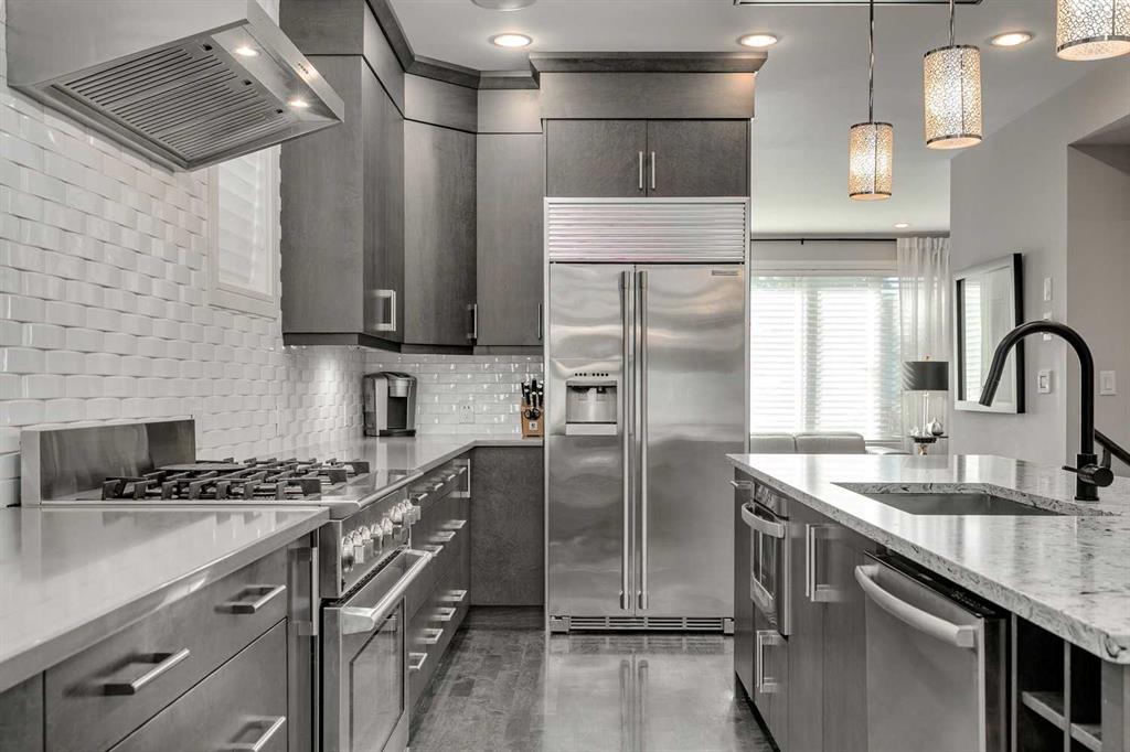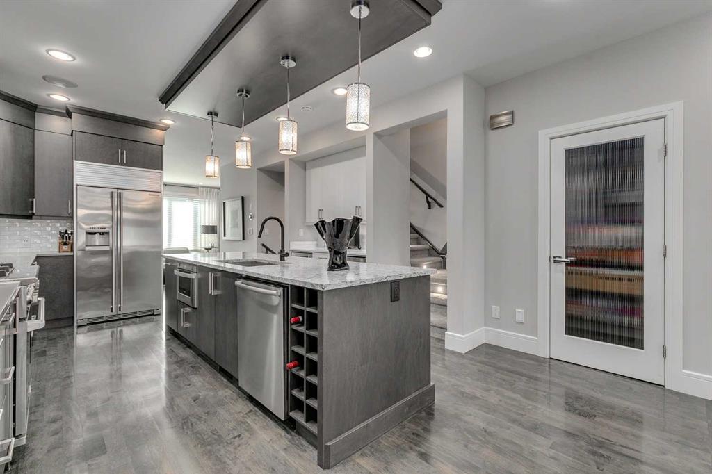 Set in Calgary’s central Windsor Park, this three-storey semi-detached home offers space, flexibility, and a design that works as well for entertaining as it does for everyday life. It combines solid construction with modern finishes and thoughtful details throughout. With over 3000 sqft of developed living space, the main floor is anchored by an open, flowing space where the kitchen, dining, and living areas connect naturally. At the front, a wall of built-ins frames the gas fireplace, giving the living room a defined yet inviting feel. The kitchen pairs clean-lined cabinetry with quartz surfaces, a gas stove, dual beverage/wine fridges, and a walk-in pantry. Just off the back entrance, a tiled mudroom with custom cabinets keeps the busy parts of life tucked out of sight. Upstairs, the primary bedroom offers a generous retreat with a walk-in closet and an ensuite featuring dual sinks, a soaker tub, and a separate shower. Two additional bedrooms and a full laundry room with sink round out this level. The top floor loft adds even more versatility, with its own bathroom and walk-in closet—ideal as a fifth bedroom, gym, studio, or quiet getaway. The basement is fully developed with in-floor heating, a bedroom, and a three-piece bathroom.