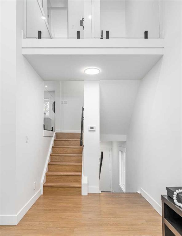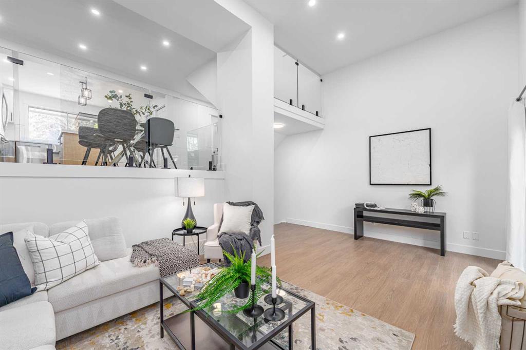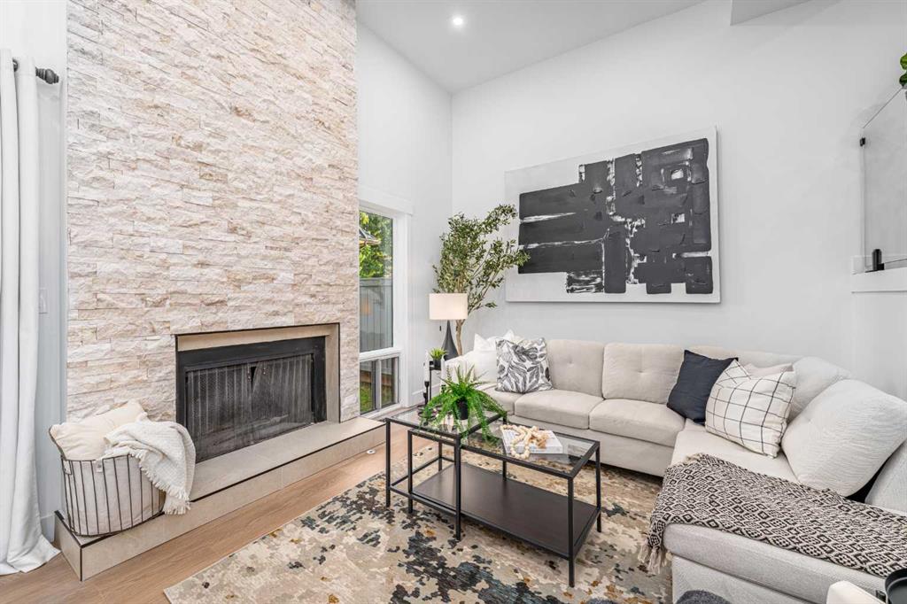 Inside, you’ll find an airy main living area with soaring ceilings, a striking feature fireplace, and windows that fill the space with natural light. The brand-new vinyl plank flooring flows throughout, creating a fresh and cohesive look. The kitchen is a showstopper with its updated cabinetry, stainless steel appliances, quartz countertops and central island—ideal for gathering with family or friends. Just off the kitchen, the dining space offers plenty of room for entertaining. Included on this level is an updated 2-pc bathroom and dedicated laundry room.