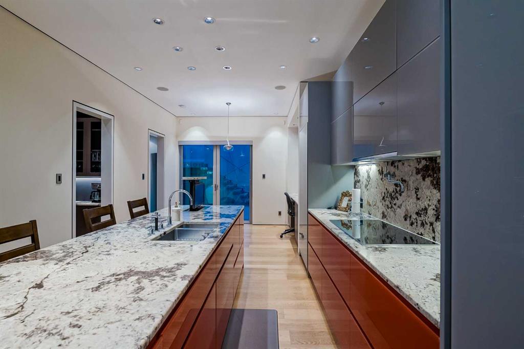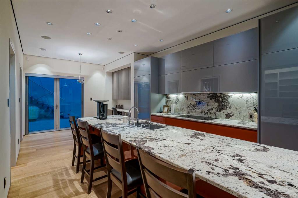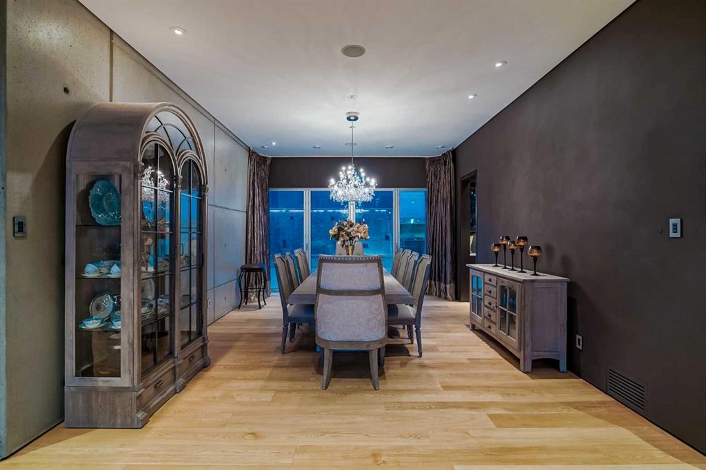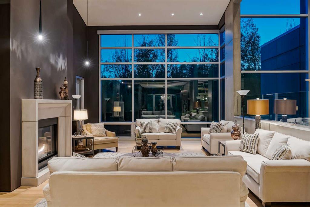 An unparalleled masterpiece in Upper Mount Royal, proudly overlooking the serene beauty of Cartier Park. This is more than a home; it\'s a statement of exquisite taste and refined living, where over 7,000 sq ft of developed space seamlessly blends style, sophistication, and luxurious amenities. Step into a realm of exclusive privacy and security, beginning with a rare geothermal heating system that extends to the front stairs, and walkway. Inside, discover a grand layout featuring 4 bedrooms plus a versatile flex room, 5 full baths, 2 half baths, and the convenience of an elevator. Architectural brilliance shines through with 10ft+ vaulted and barreled ceilings, complemented by rich oak, marble, and porcelain tile flooring. This is a true Smart Home, offering integrated control over security, heating, lighting, sound systems, TVs, camera surveillance. The welcoming front entrance opens to a dramatic free-standing staircase leading to the main floor\'s expansive living room, boasting sweeping park views and a double-sided gas fireplace shared with a cozy family room. The family room extends to a sunny west-facing patio, flowing into an ultra-modern kitchen equipped with top-tier Miele and Sub-Zero appliances, granite countertops, lacquered cabinets, an island with a pop-up TV, and two butler’s pantries. The formal dining room invites grand entertaining, opening onto a patio with an outdoor kitchen and a stunning water feature. The main floor primary suite is a private sanctuary, featuring a spa-like ensuite with a steam shower, dual sinks, a large walk-in closet, and a vanity with a behind-mirror TV. A second main floor bedroom with ensuite, a spacious laundry room, and an elegant powder room with an under-lit onyx countertop complete this level. The upper floor reveals two more generous bedrooms, each with an ensuite, alongside a large, naturally lit bonus room. Descend to the first floor to find an impressive, park-view gym, a Swim-in-Place lap pool with an underwater treadmill, a steam room, and a changing room. Entertainment awaits in the state-of-the-art theatre, boasting 5G projection, 15 plush recliners, a wet bar with a U-line fridge, and a dedicated A/V security room. This level also includes a large, productive office space. The lower floor is a connoisseur\'s dream, featuring an air-conditioned, humidified wine room and direct access to a 5-car garage with a power rotating platform, a Tesla electric car charger, ample recreational vehicle parking, and even a convenient dog wash. Additional luxuries include hot water on-demand with two storage tanks, a soft water system, and sun-protective automatic awnings on the back patio and front balcony. The back yard is enhanced by a 3-burner BBQ with gas side burners and elegant waterfall. This is a truly one-of-a-kind home in one of Calgary\'s most prestigious communities. Its incredible location offers access to designated schools, trendy 17th Ave and ease of access to downtown.
