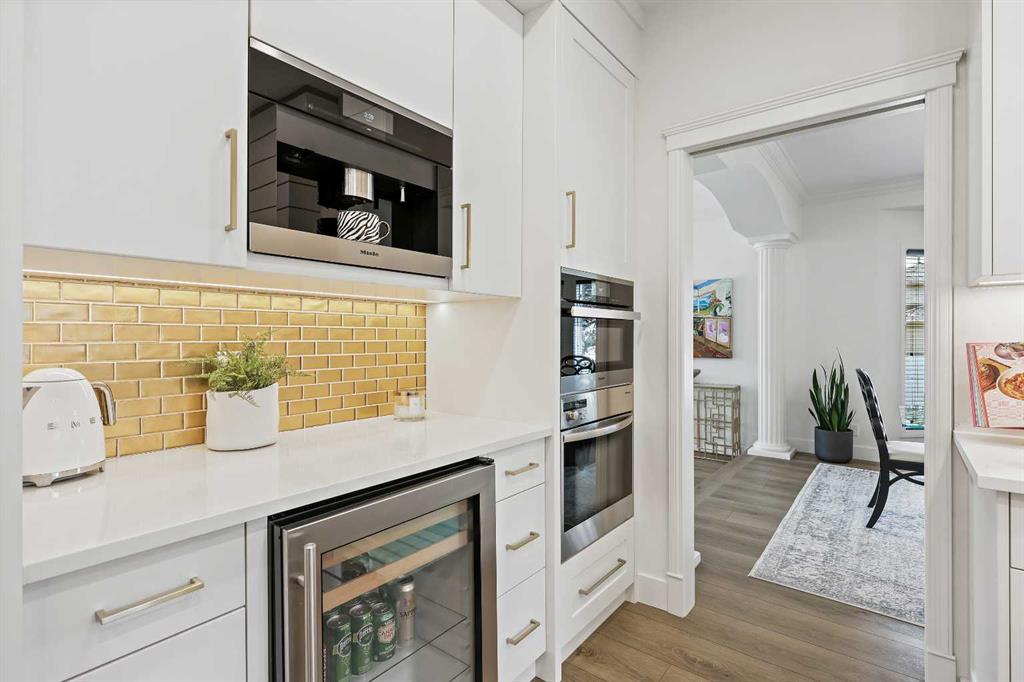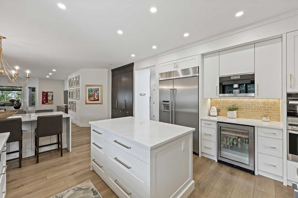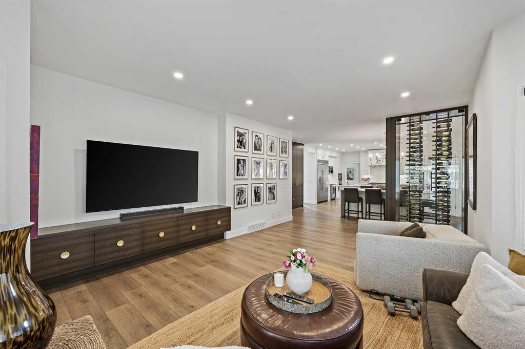 At the heart of the home is a truly remarkable chef’s kitchen featuring dual quartz-topped islands, a full Miele appliance package including built-in ovens and gas cooktop, an espresso station, a wine fridge, walk-in pantry, and a dramatic floor-to-ceiling glass wine display. The adjacent open-concept family lounge offers seamless access to the west-facing wrap-around new composite deck, ideal for sunset dining and year-round enjoyment.