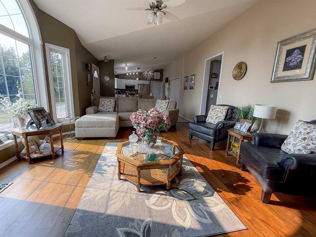 Peaceful country charm on 6.45 acres in Gordondale, Alberta! This 2-bedroom, 2-bathroom luxury modular home has been thoughtfully designed for comfort and style, with brand new shingles adding to its appeal. Inside, the open-concept kitchen, dining, and living area is filled with natural light under a vaulted ceiling. The kitchen offers an island, ample counter space, pantry, stainless appliances, and bright white cabinetry. The living room features warm hardwood flooring, creating a welcoming space to gather. A huge attached porch is a true bonus—complete with a wood stove, storage, and a cozy window seat, perfect for year-round enjoyment. The landscaped yard is dotted with mature trees and offers a lovely country view, making it an inviting outdoor retreat. Practical touches include a large storage shed with an overhead door and reinforced floor, along with central air conditioning to keep the home cool all summer. A well-maintained property in a private, serene setting—ready for you to make it your own. Call the agent of your choice for a private viewing!