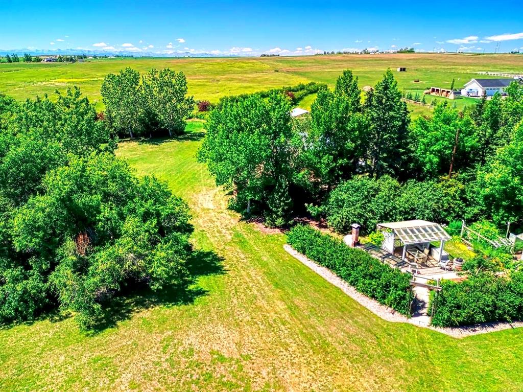 20.07 acres. This private property has a beautiful home with a heated oversized double attached garage and sits on a hill with wonderful views. Also included is a huge 32 x 40 HEATED WORKSHOP (220 volt in shop), 22 x 24 BOATHOUSE, GREENHOUSE, RV Parking with electrical hookup, Covered Gazebo, Shed, Covered BBQ station. Solar panels also for electricity (economical and offset the cost for electricity). RMS above grade is 1635sqft, below grade is 1248sqft. As you walk in you will be greeted to the front foyer with tons of area. The main floor has a country kitchen with many cabinets, pantry and a side “coffee bar” with more cabinets and sink. The living/dining/entertainment room is fantastic for visiting, entertaining or to sit quietly, read a book, watch tv or look out the large windows that gives you all the natural light you desire. The bedrooms have large walk-in closets and the other room you could use as the third upper bedroom or the office with built-ins. The laundry room is also on the main floor. Downstairs is mostly open concept that has a family room with gas fireplace, pool table area, jacuzzi tub area, 4th bedroom, bathroom, utility room, storage room, and a pantry/cold room. In this home you can appreciate the many areas of custom shelving for your items to have their own space. In their own growing season, enjoy the raspberries, saskatoons, grapes, apples and the garden for what you want to grow and so much more. The rose bushes, wildflowers, shrubs and mature trees are beautiful and make the property feel tranquil and calm. Kids, pets and even adults can enjoy the open space to run, play and relax. When you come and view, you will see and appreciate the care and love that this home and property has. Short drive to Okotoks, High River or Calgary for all the amenities.
