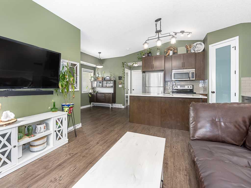 **Significant Price Reduction** Experience this bright and well-appointed one-level townhouse in Airdrie, where modern comfort meets refined living. Perched on the top floor, this two-bedroom, two-bathroom home impresses with soaring vaulted ceilings and expansive windows that flood the space with natural light. The kitchen features quartz countertops, stainless steel appliances, sleek cabinetry, and a large island with eating bar, perfect for everyday living or entertaining. The open-concept design flows seamlessly into the dining and living areas, creating an inviting space to gather or unwind. The private primary suite offers a walk-in closet and ensuite bathroom, while the second bedroom and full bath provide versatile options for guests, family, or a home office. Step outside to the sun-filled south-facing deck ideal for relaxing or hosting summer barbecues. Additional highlights include in-suite laundry, two parking stalls (one titled, one assigned), and the convenience of low-maintenance living in a well-cared-for community. With breathtaking rural vistas, close proximity to Airdrie’s pathways, parks, and amenities, plus just a short 15-minute drive to Calgary, this home is the perfect blend of style, comfort, and location. Don’t miss it!