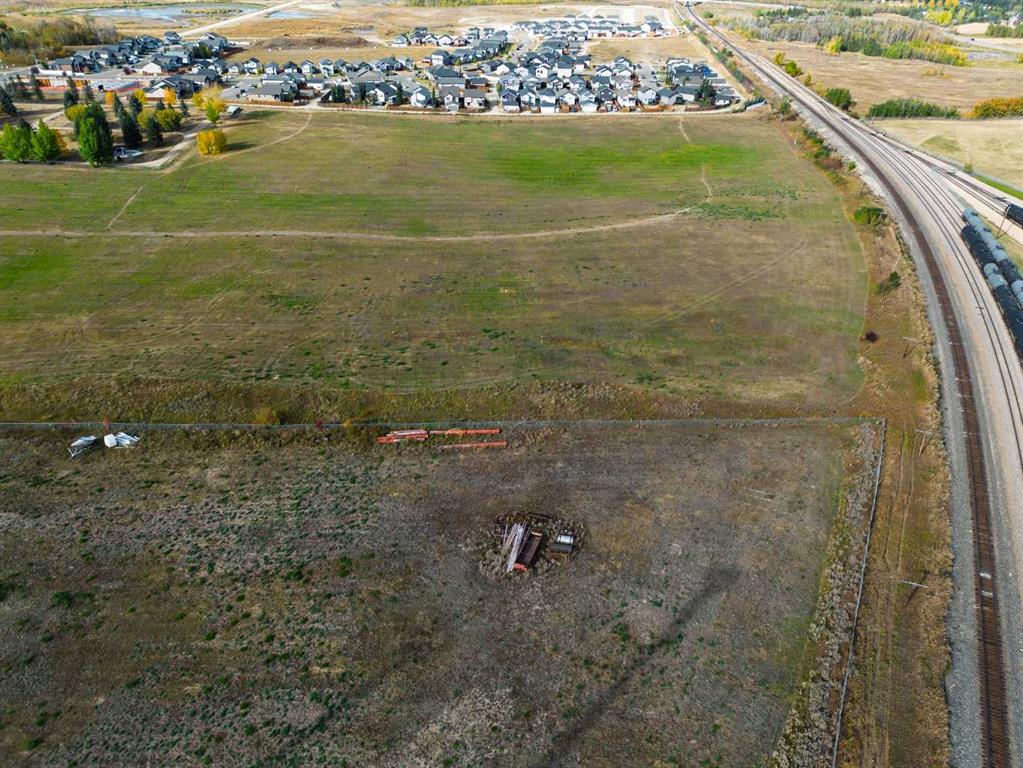 Development opportunity in the heart of Blackfalds! 33.43 acres identified as either light industrial or residential in the Town of Blackfalds Future Land Use Plan. Approximately 30% of the south end of the site has been used for industrial use including metal fabrication and welding. That portion of the site has a compacted gravel surface and is improved with a 40\' X 80\' steel building with boiler fired underfloor heat, a small mezzanine, 2 pce. washroom, 3 - 12\' X 16\' overhead doors and two man doors. There is also a separate 30\' x 32\' office building with 3 offices, 2 pce bath, lunch room and furnace room. Potential uses might be multi-family development (apartment and/or row housing), mobile home park or light industrial. The large building would make a great community centre in a multi-family or mobile home park. The balance of the land is native soil.