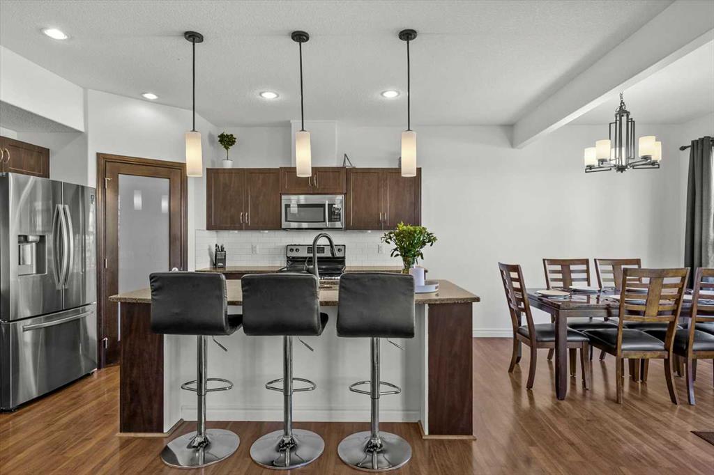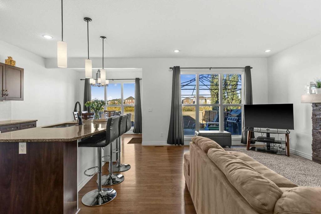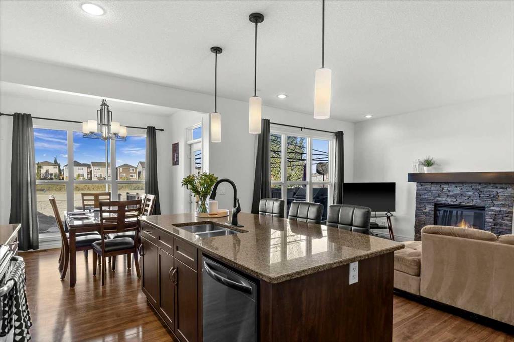 Step into an open-concept main floor where natural light pours in, highlighting the chef-inspired kitchen with rich cabinetry, granite countertops, a central island & eating bar with pendant lighting, has a seamless flow to the dining and living areas. A striking stone-surround fireplace creates a cozy anchor for evening gatherings, while expansive windows frame views of the west-facing backyard.